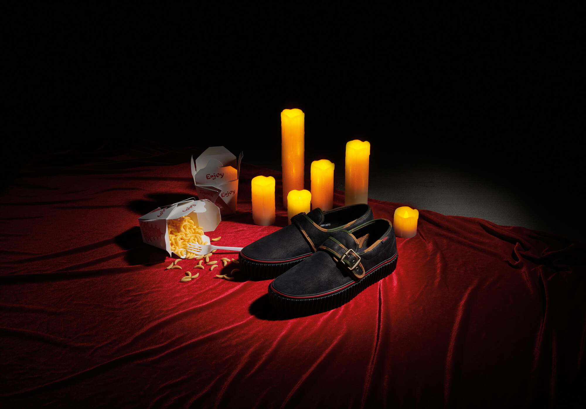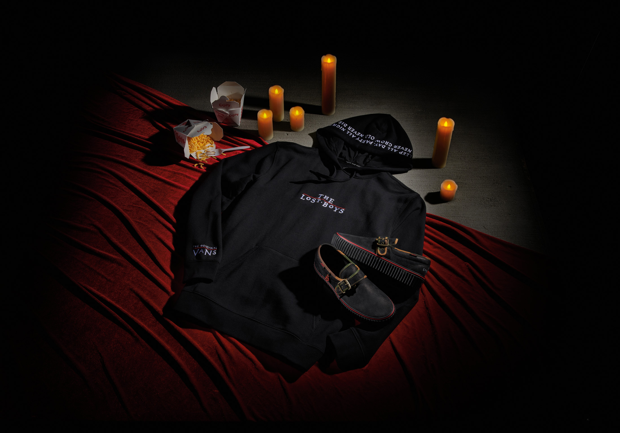 アパレルとSLIP ONのプリントされたディテールには暗闇で光る要素があり、