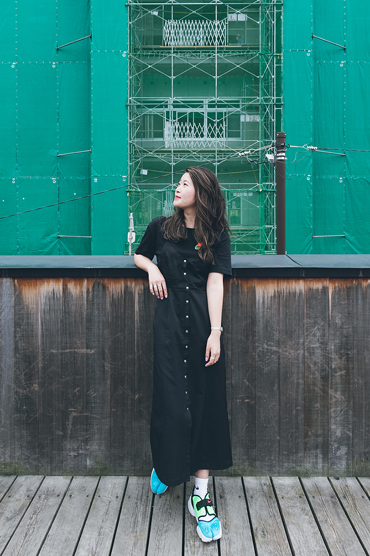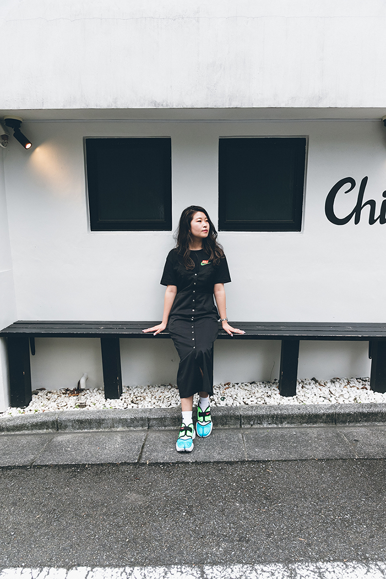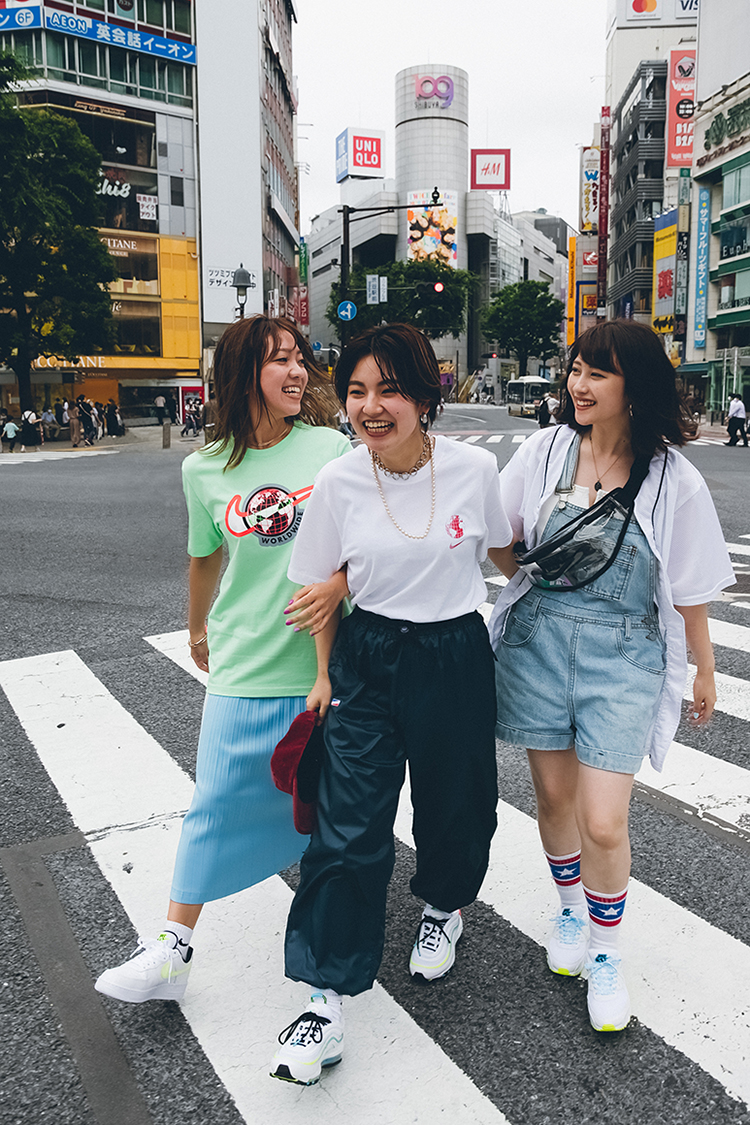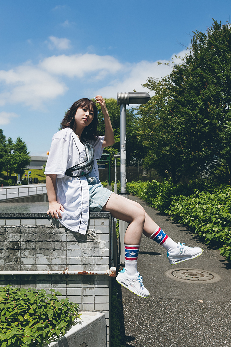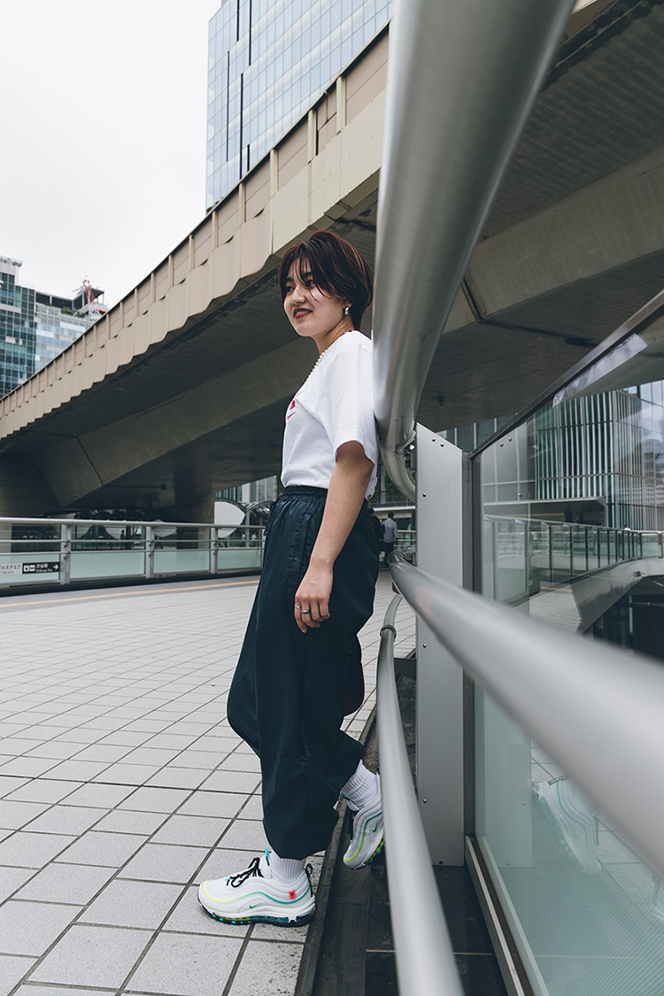 AIR MAX 95のボリューム感と配色に合わせてふんわりとしたワンピースとTシャツでスタイリング。 スタッフ着用サイズ S (スタッフ身長 158cm)