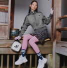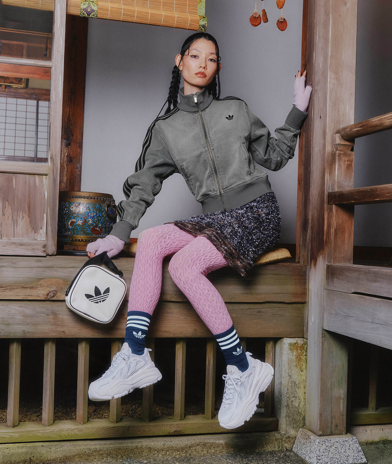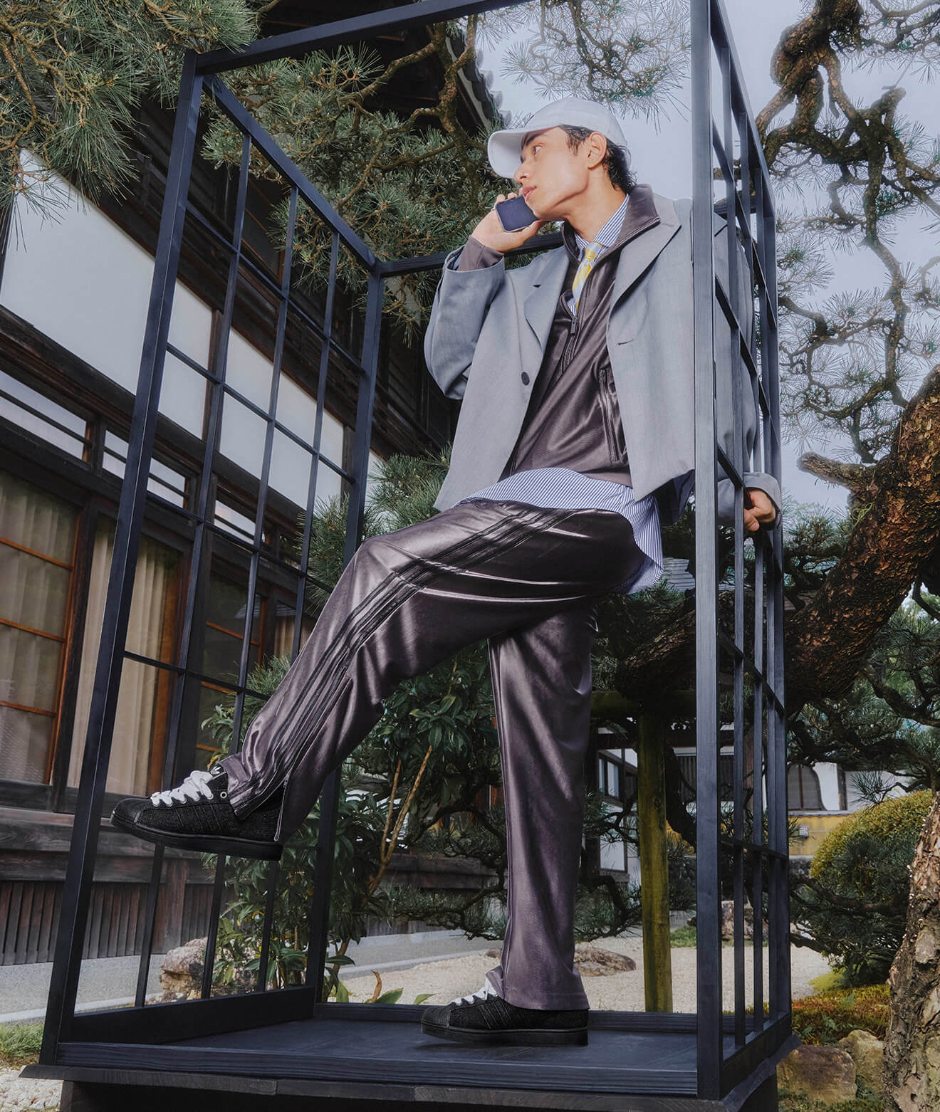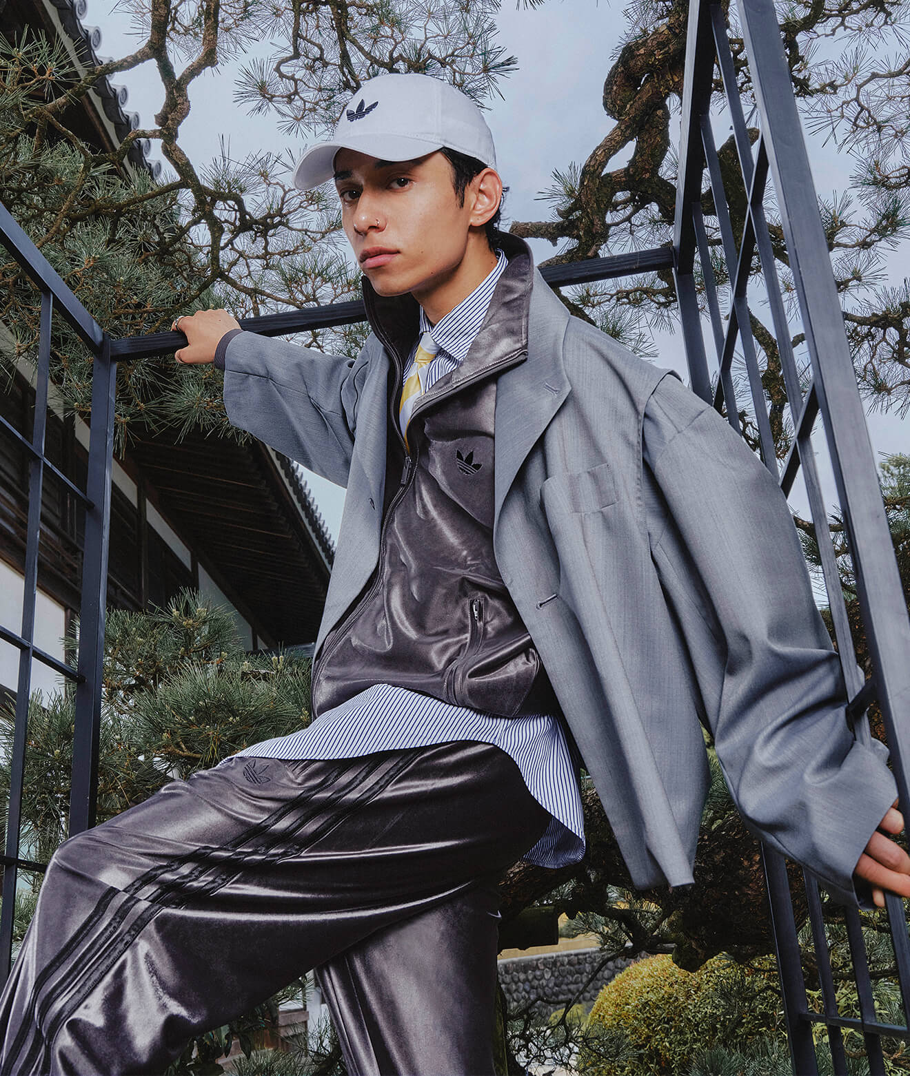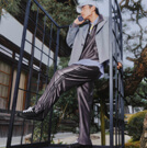 足元のシューズは淡くポップなシルバーの色味が