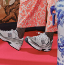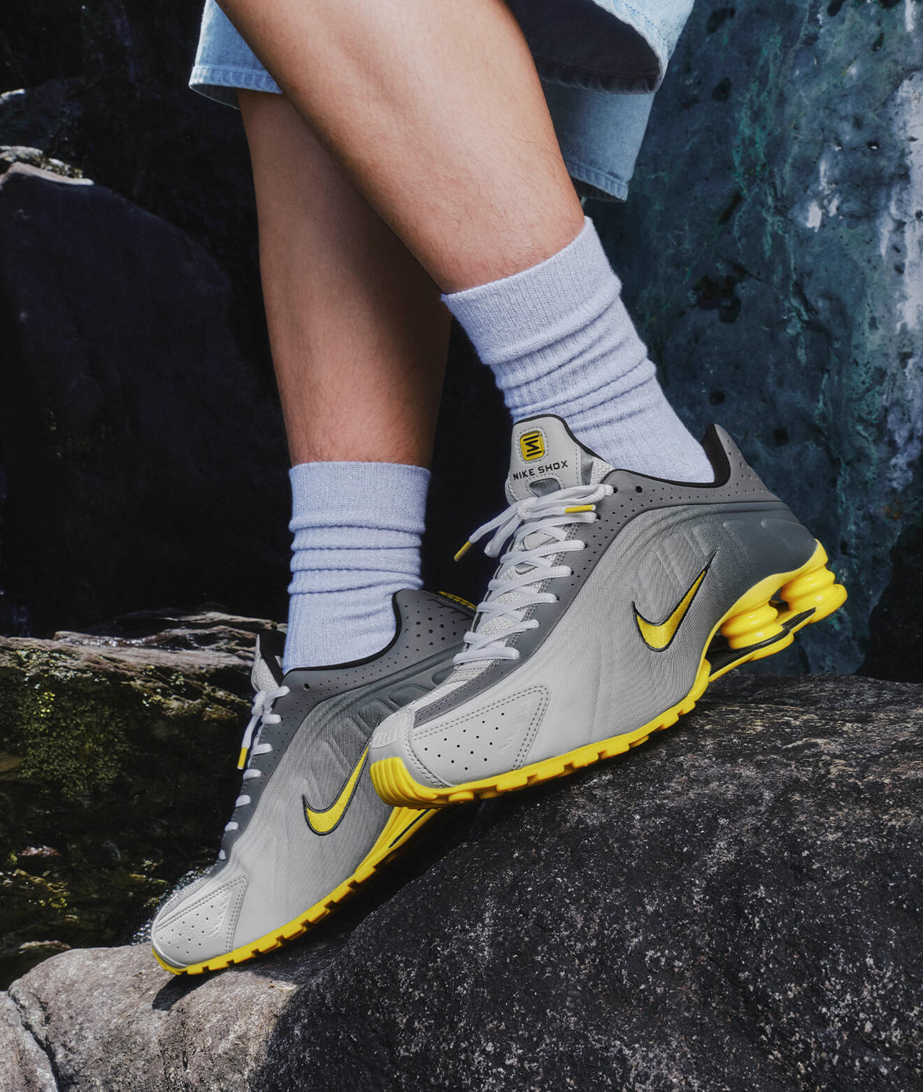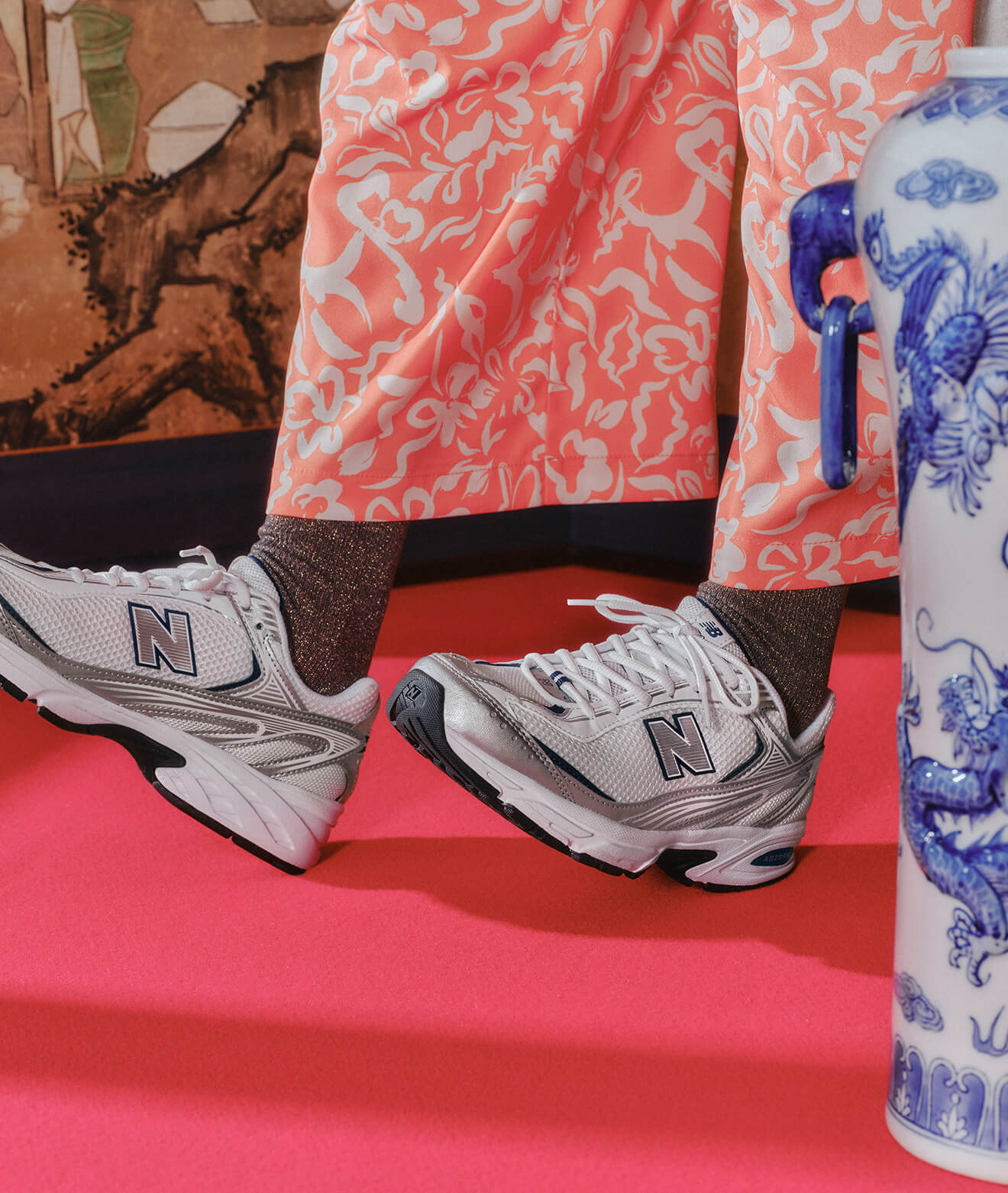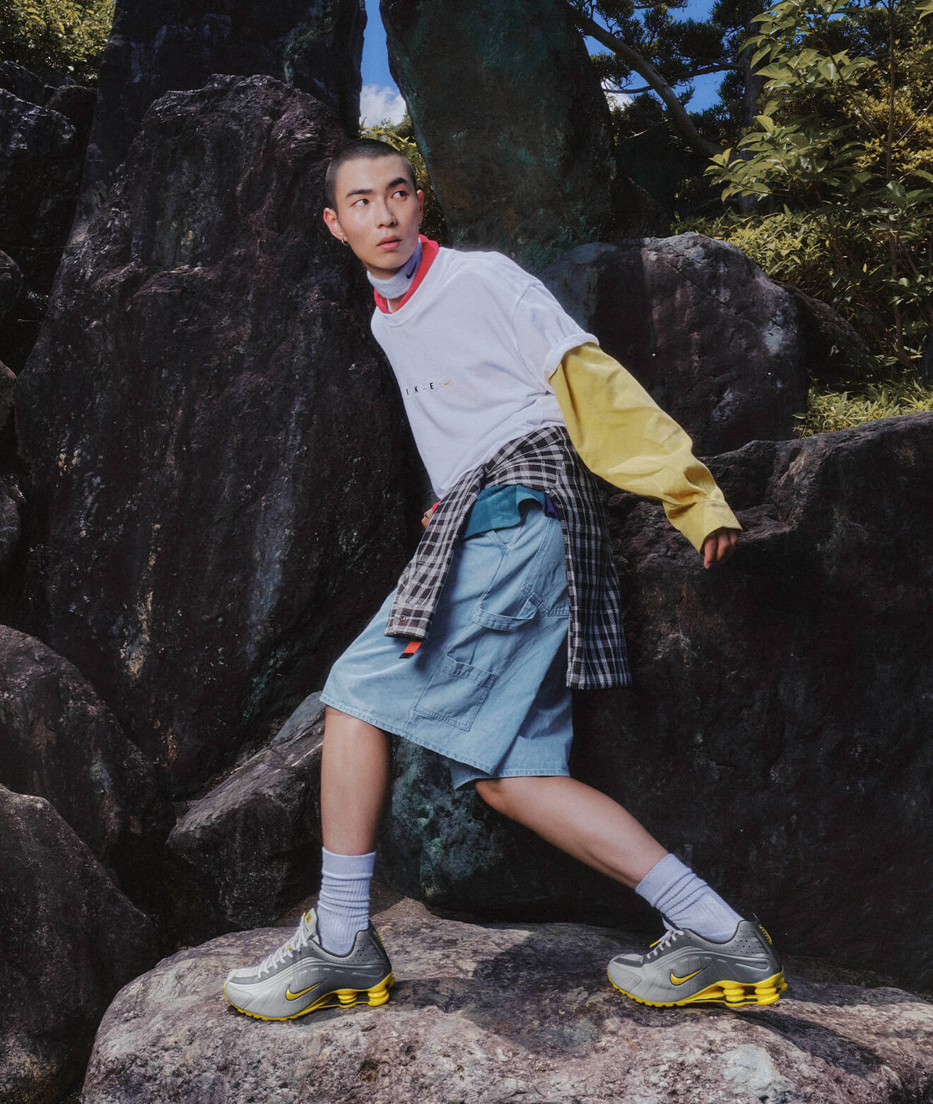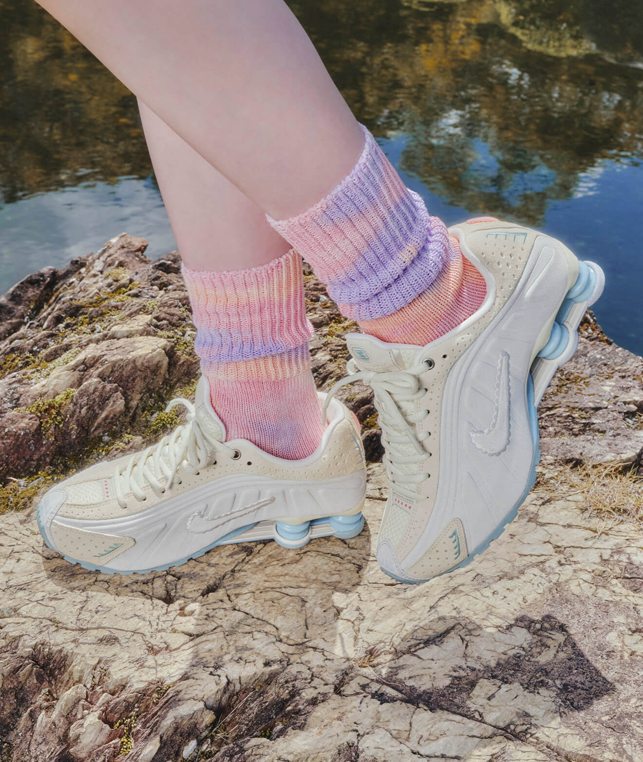 足元のシューズは淡くポップなシルバーの色味が