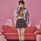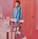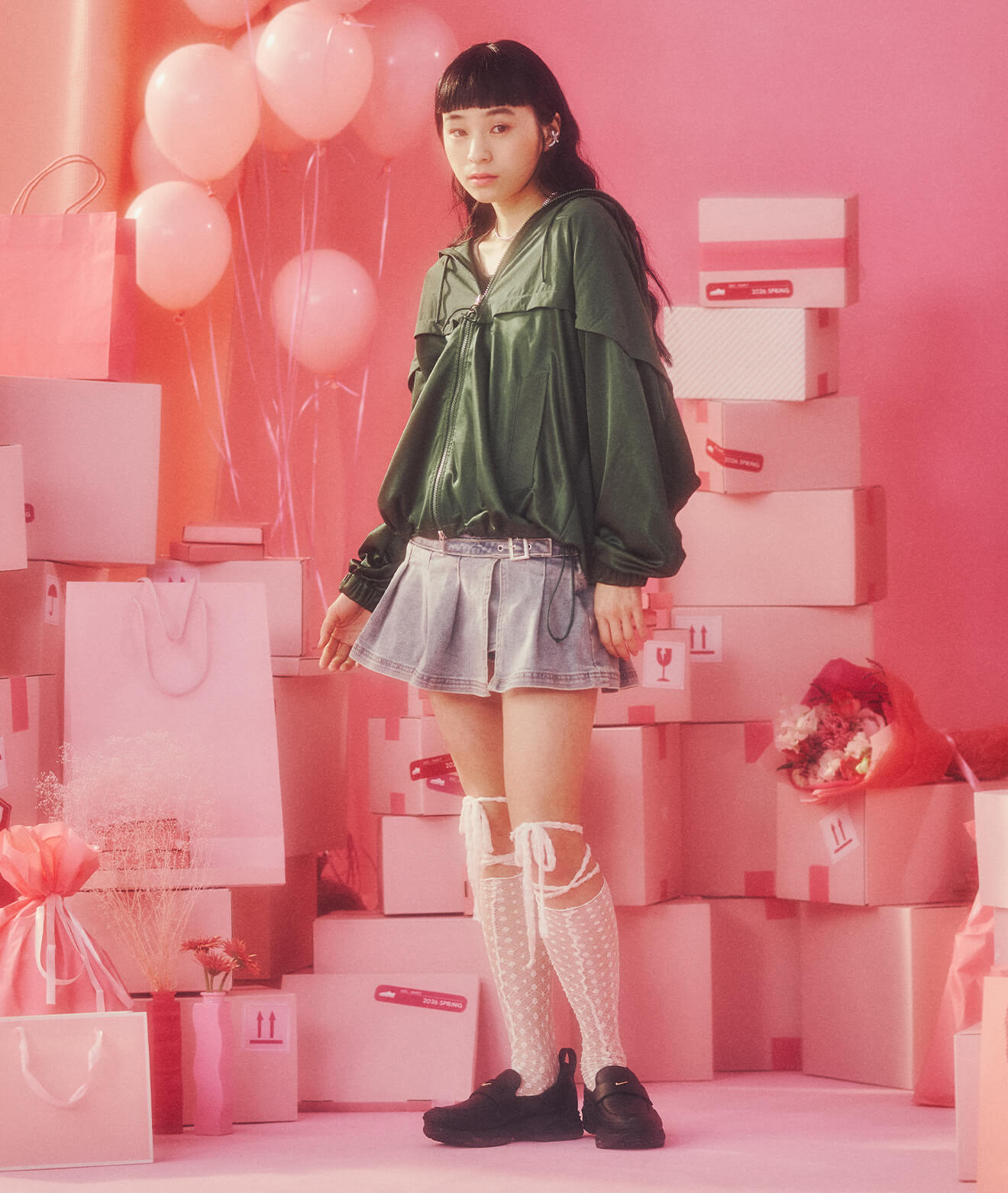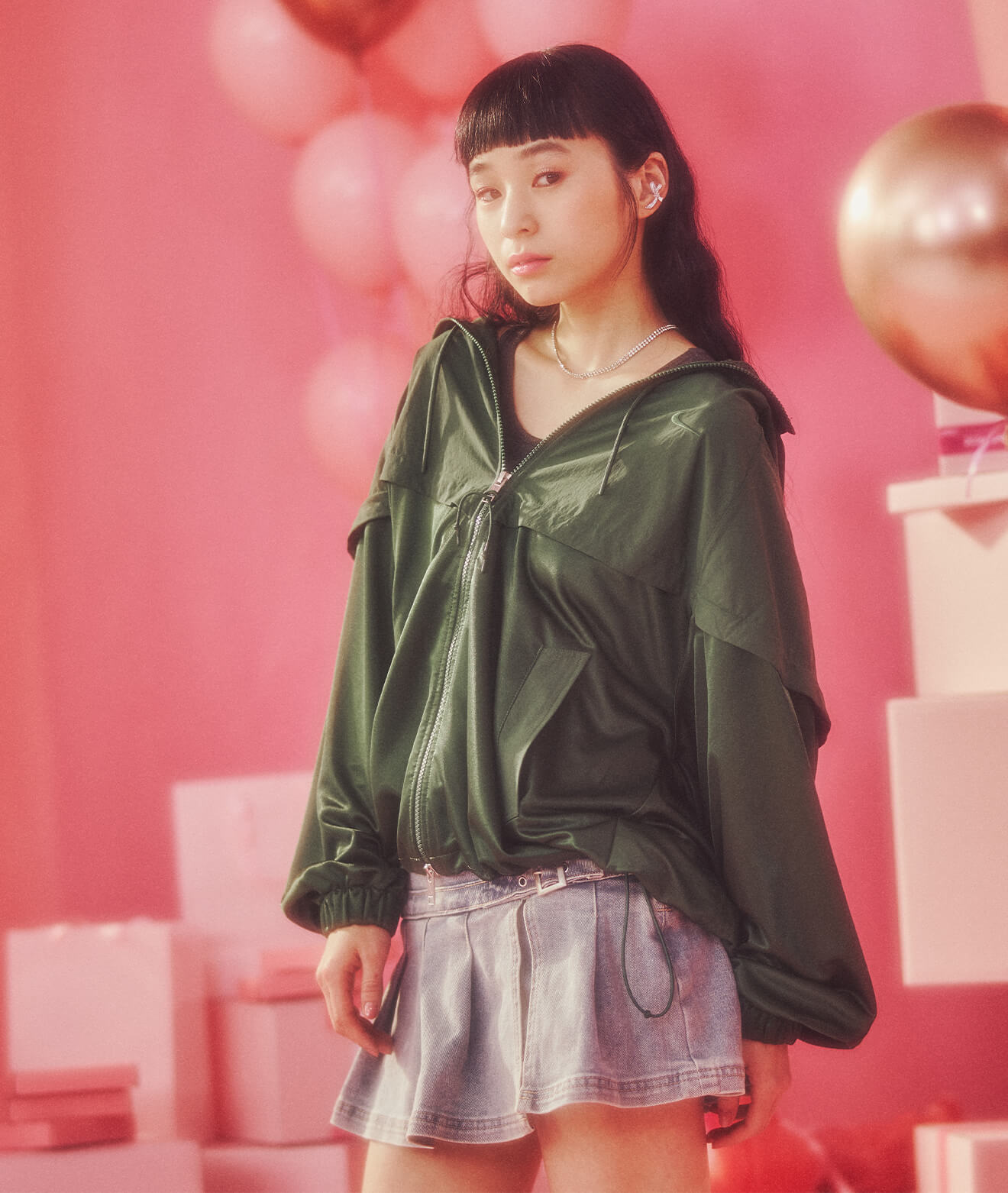 軽やかなフーデッドジャケットとバブルスカートで