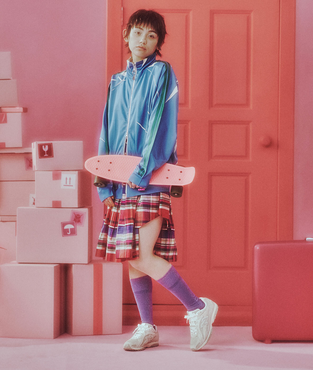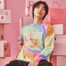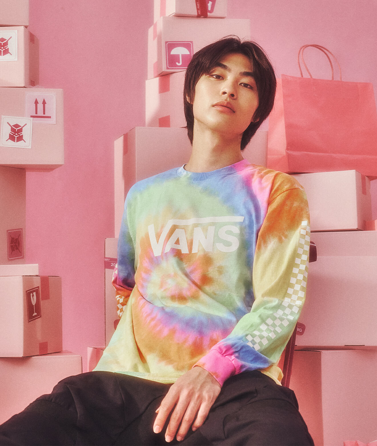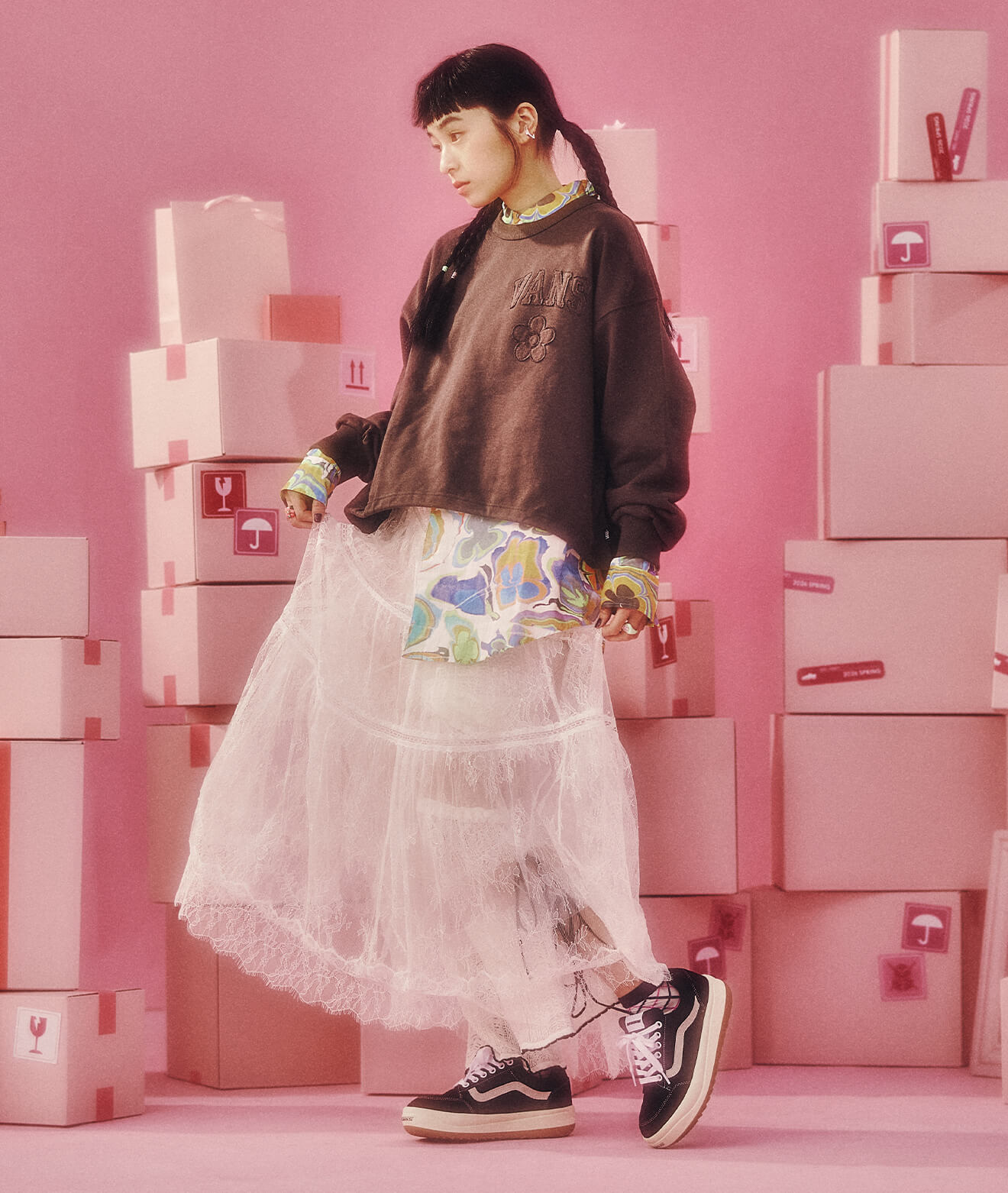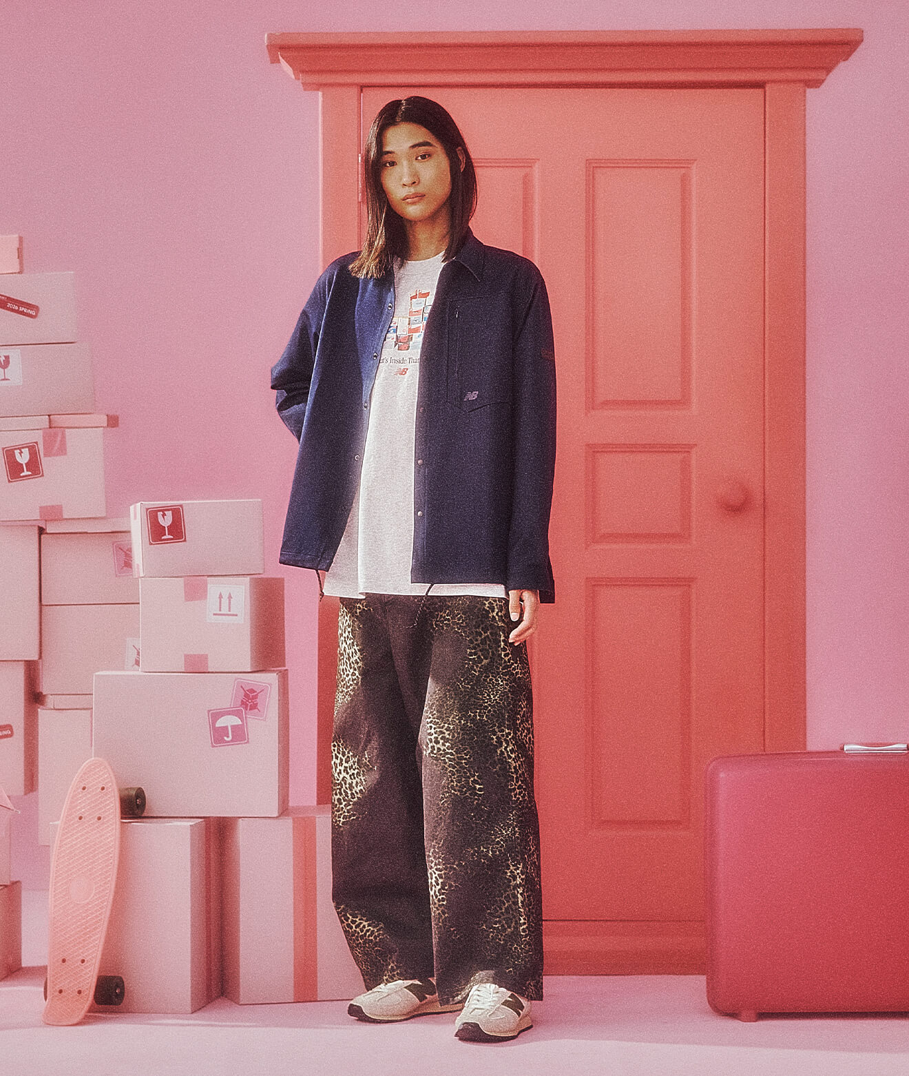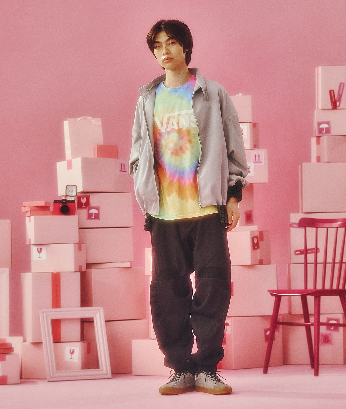 足元のスケートシューズが全体をラフに引き締め、