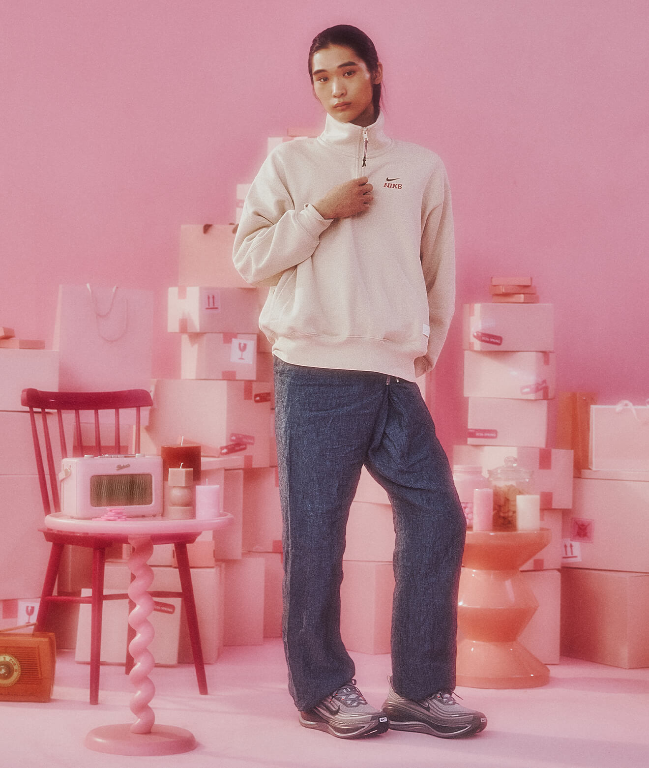 クリーンなスウェットとデニムでまとめた