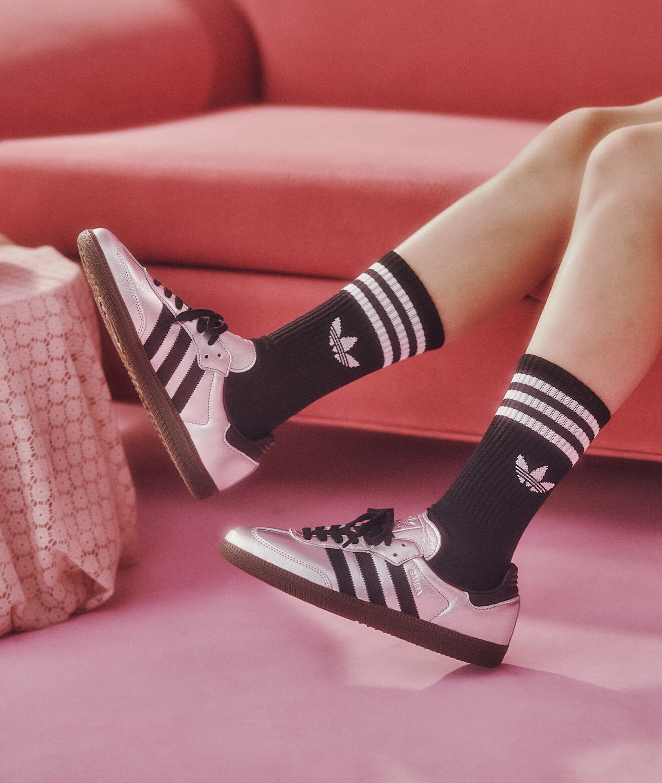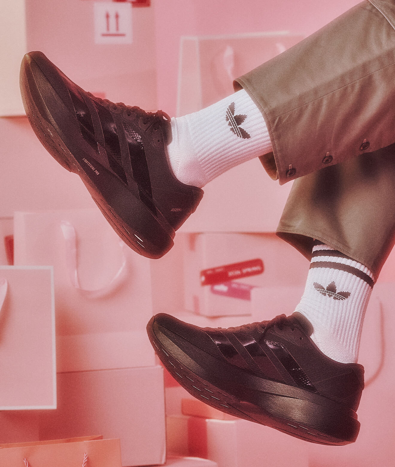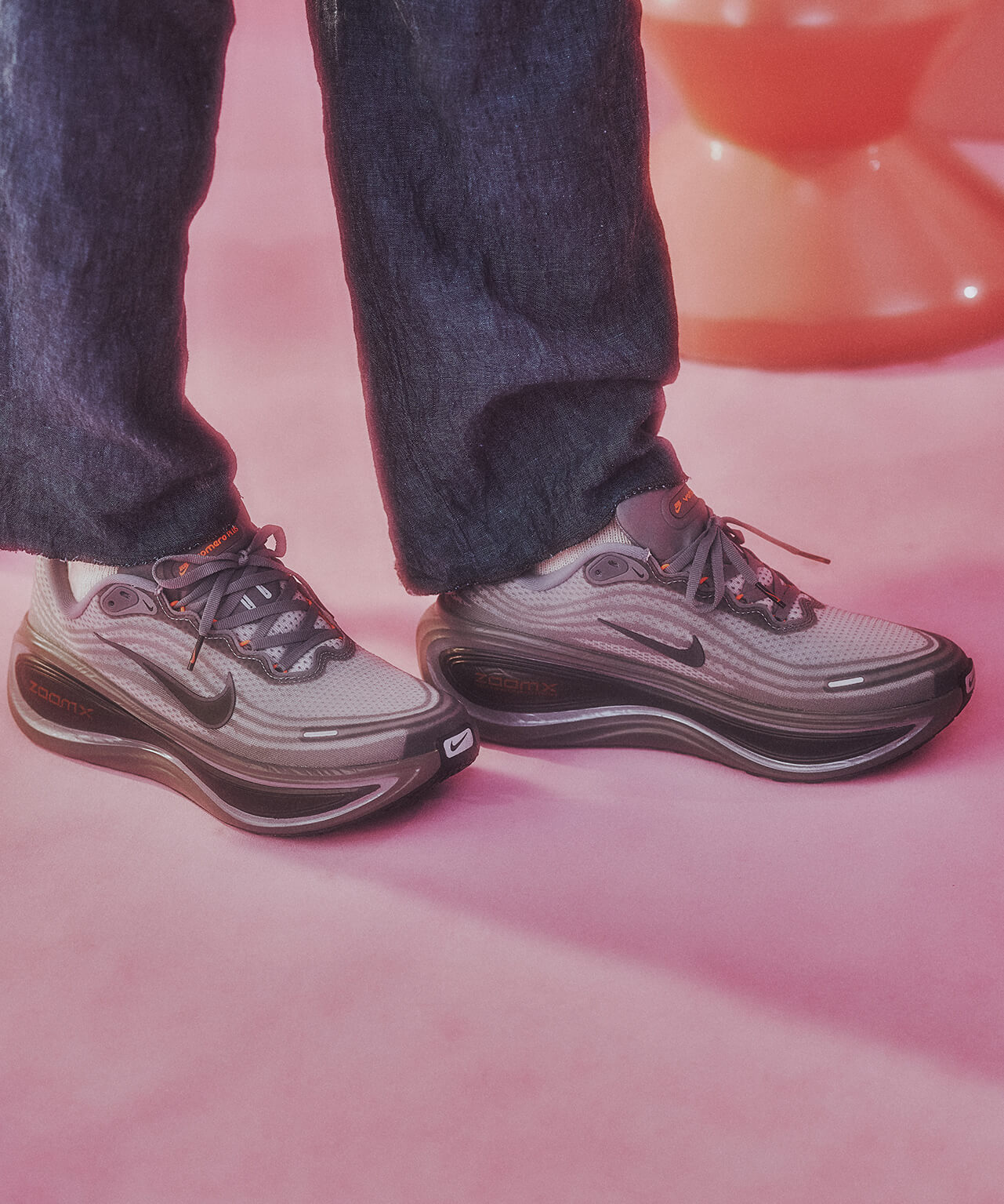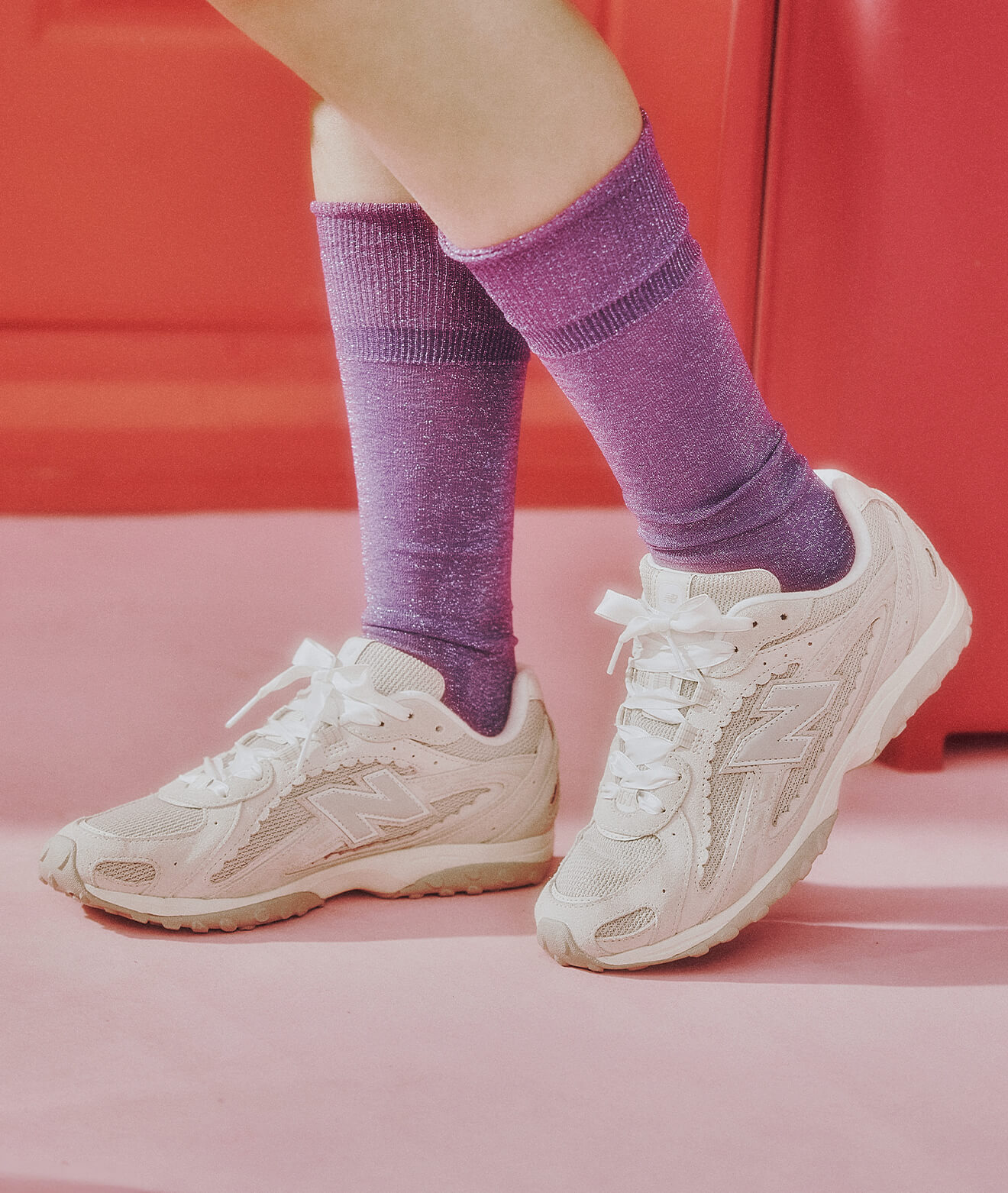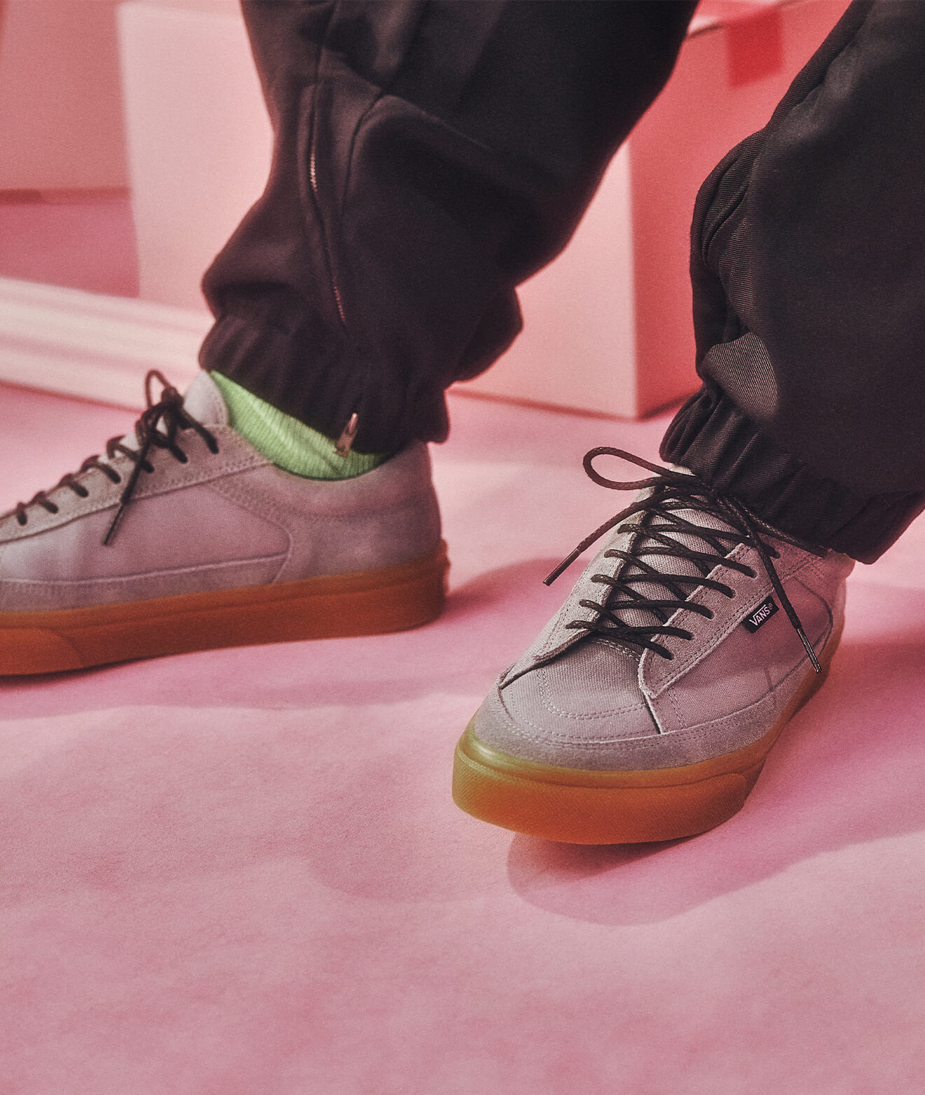 ガムソールのスニーカーが足元に重心を置き、
