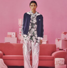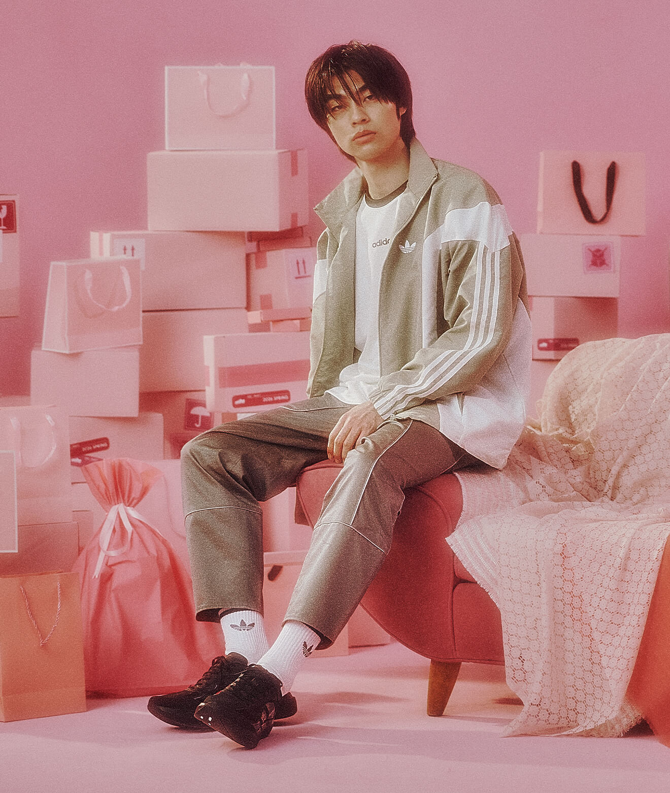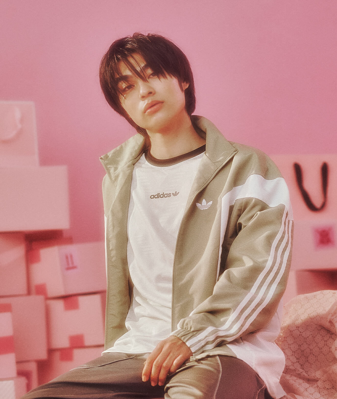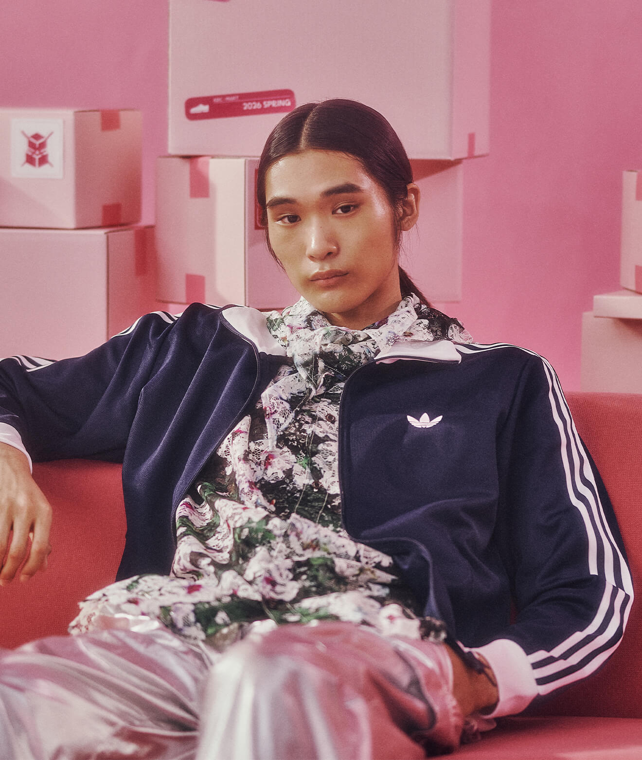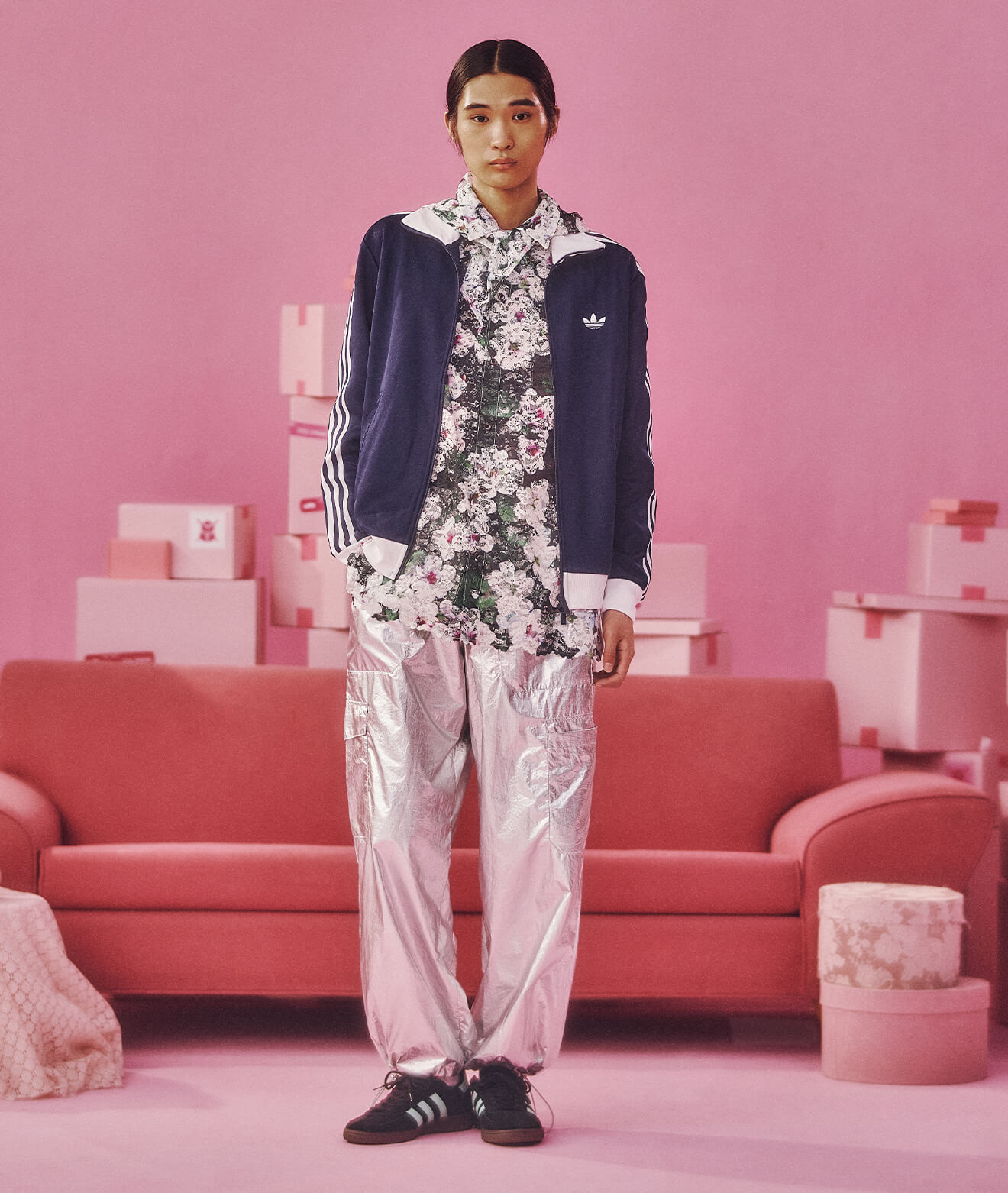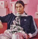 クラシックなトラックトップに異素材パンツを重ね、