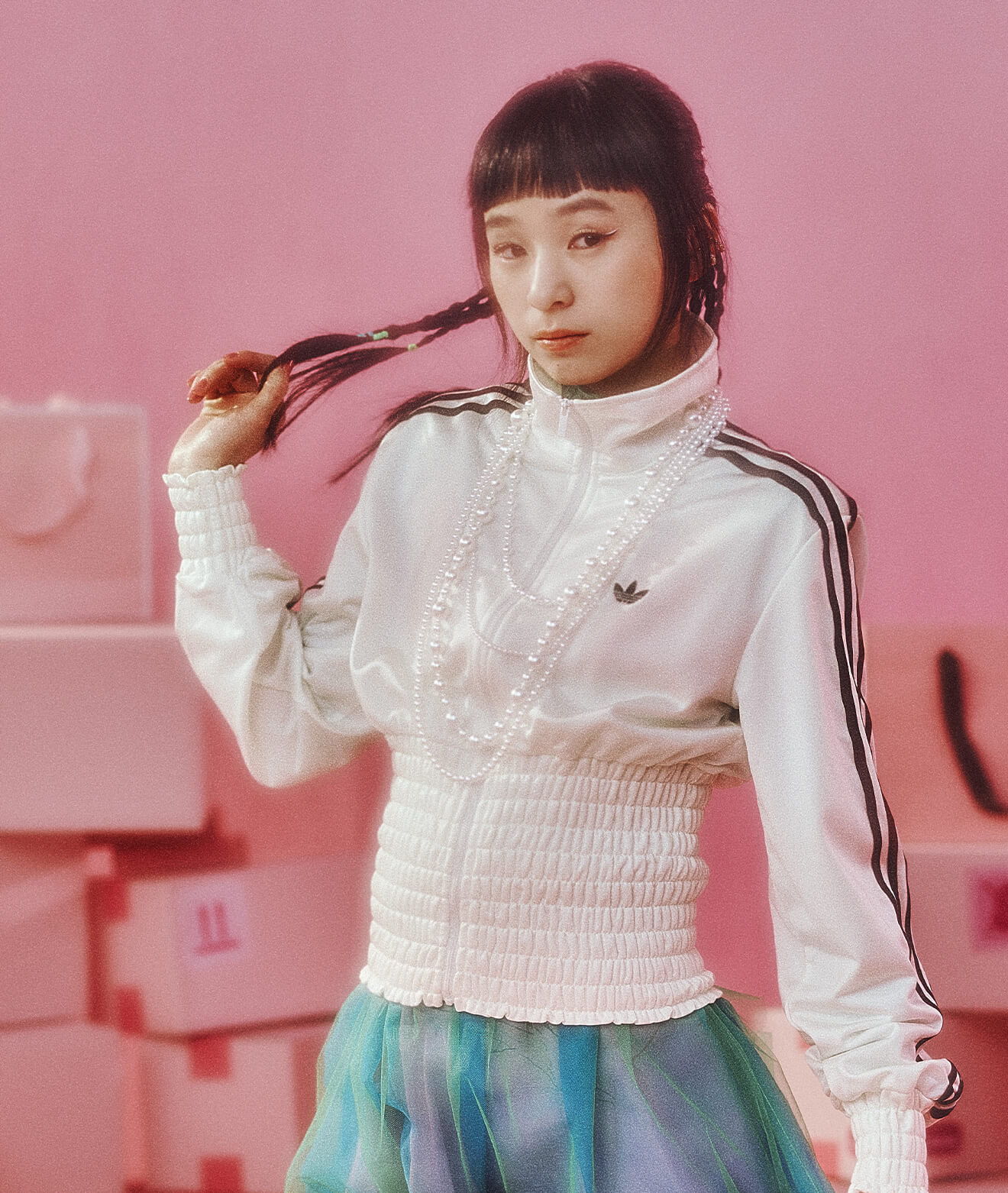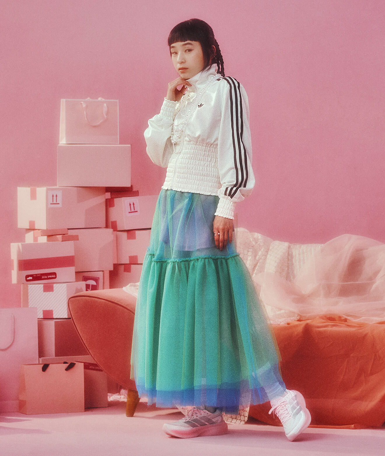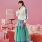 スポーティなトップスに軽やかなチュールを重ね、