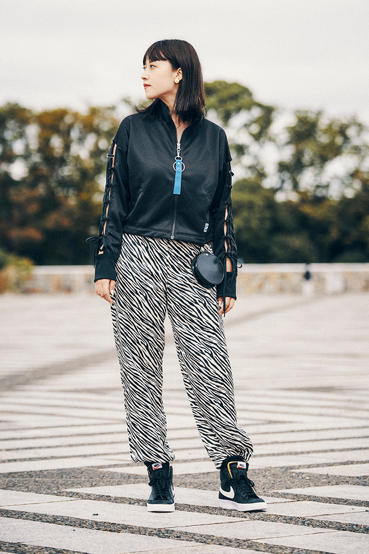 今年流行のゼブラ柄とバケットハットとベルトバックを組み合わせて、旬なストリートスタイリングに。