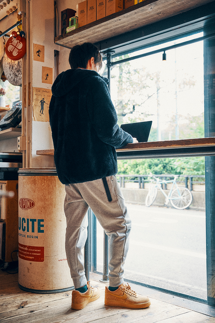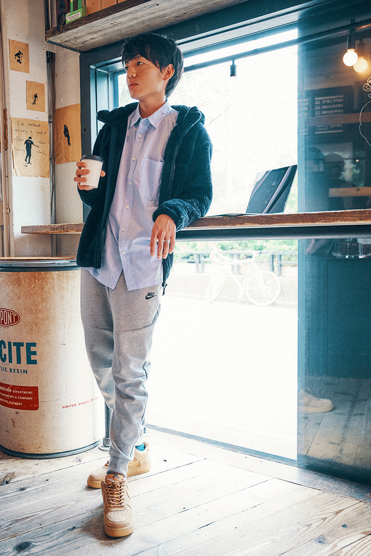 フリースとスウェットでカジュアルさを出し、