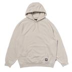 裾にブランドネームのタグが施されたシンプルなデザインのプルオーバーフーディ。