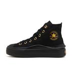 ハトメやジッパー、アンクルパッチとヒールラベルのロゴをゴールドに統一し、オールブラックでまとめた上品かつ華やかなデザイン。