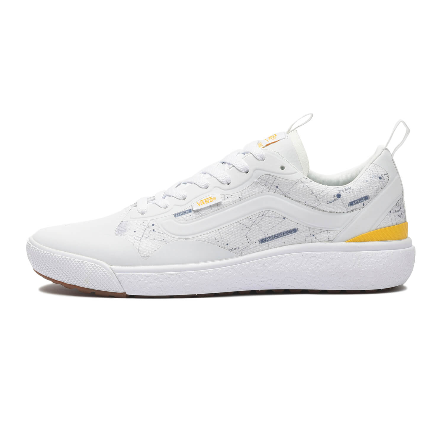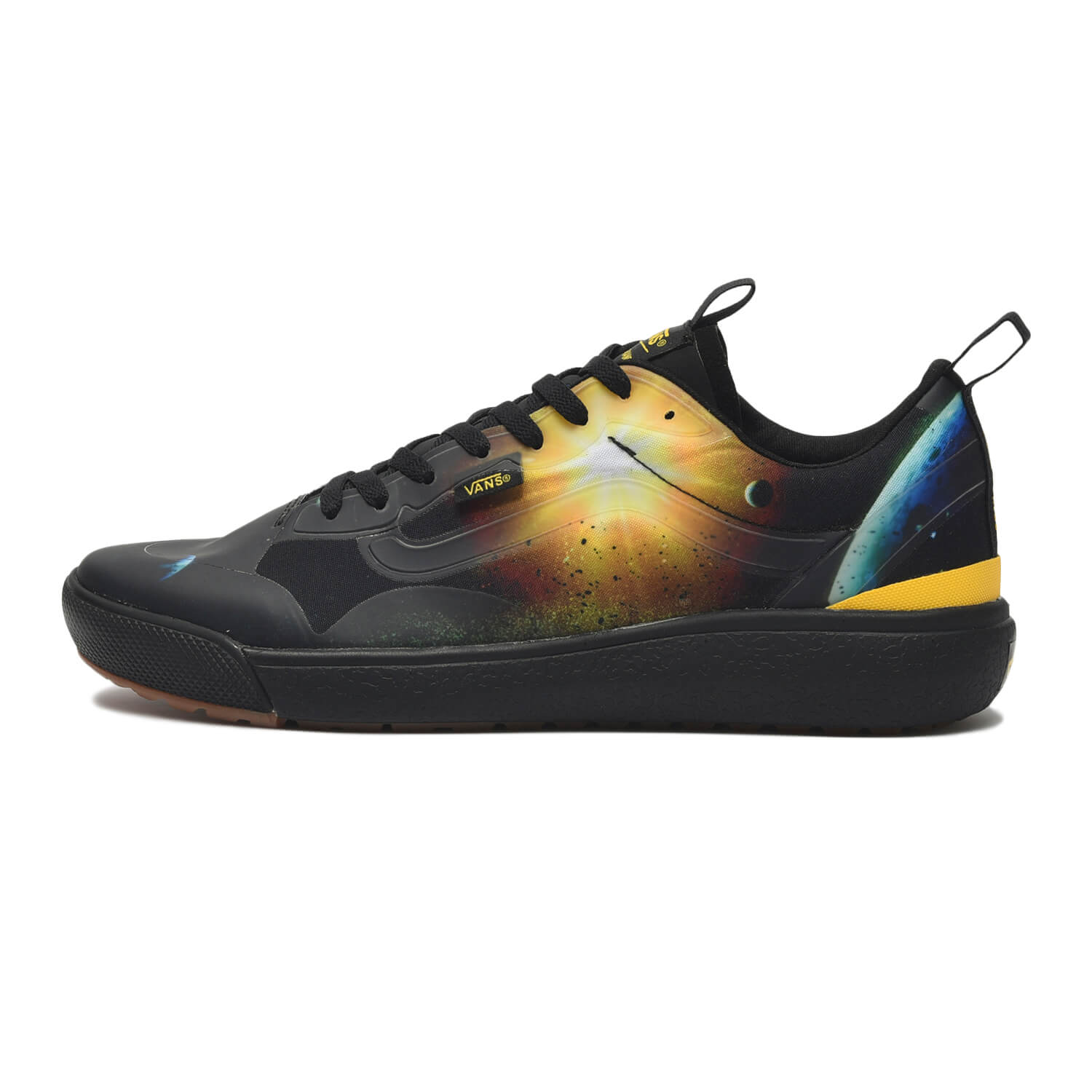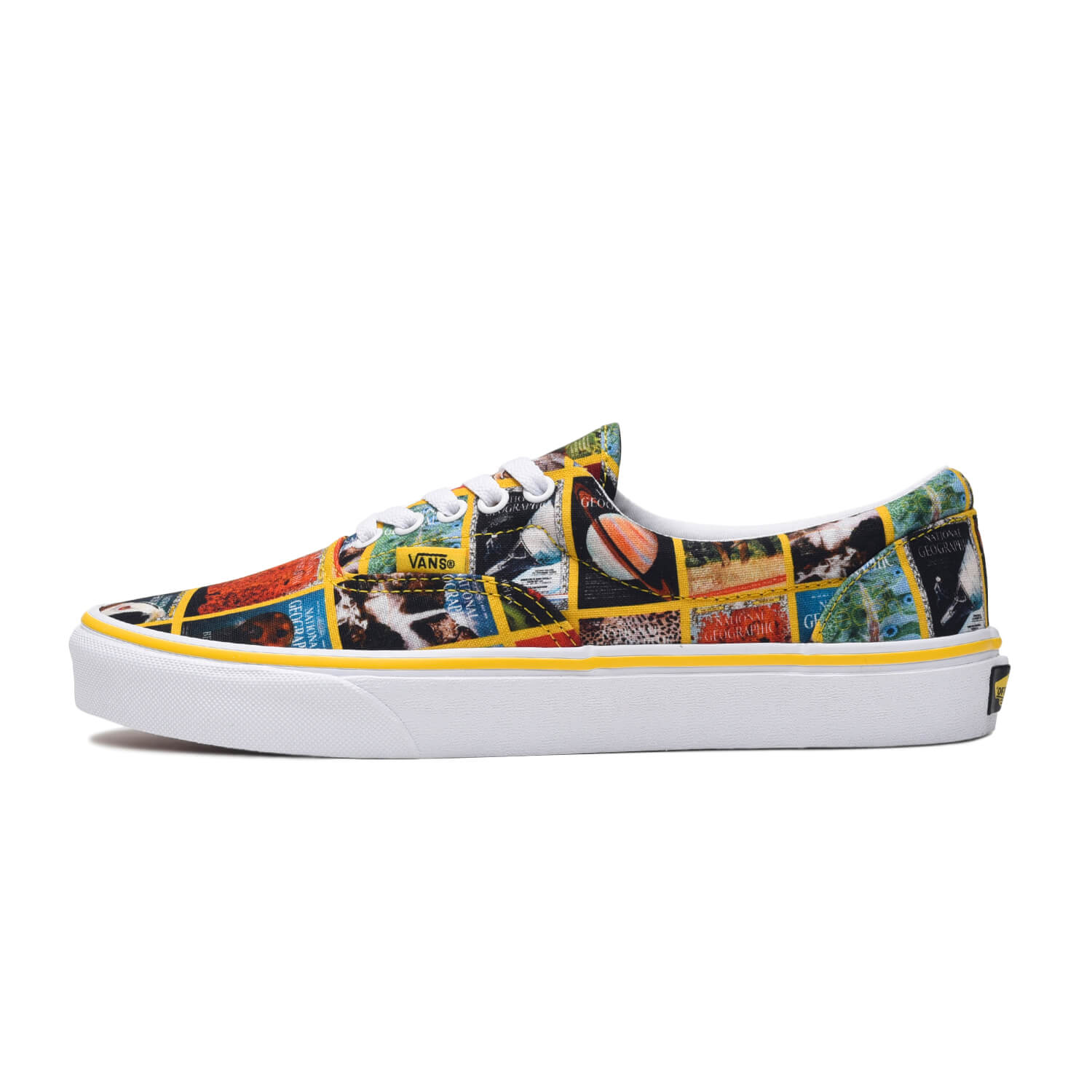 アイデンティティのハイカットを強調するように、立体刺繍のロゴをヒールに大々的に配した人気モデル、SK8-HI。サーフラインに乗り上がって主張するロゴの存在感からはまさに“型破り”な印象を受ける。スケーターシューズとして長く愛されてきたモデル「ERA」には、ナショナルジオグラフィック誌の表紙に登場したビジュアルを大胆にコラージュ。雑誌のカバーデザイン「イエローボーダー」をモチーフにしたラインは、VANSの定番パターンのひとつ「チェッカー」を想起させる。