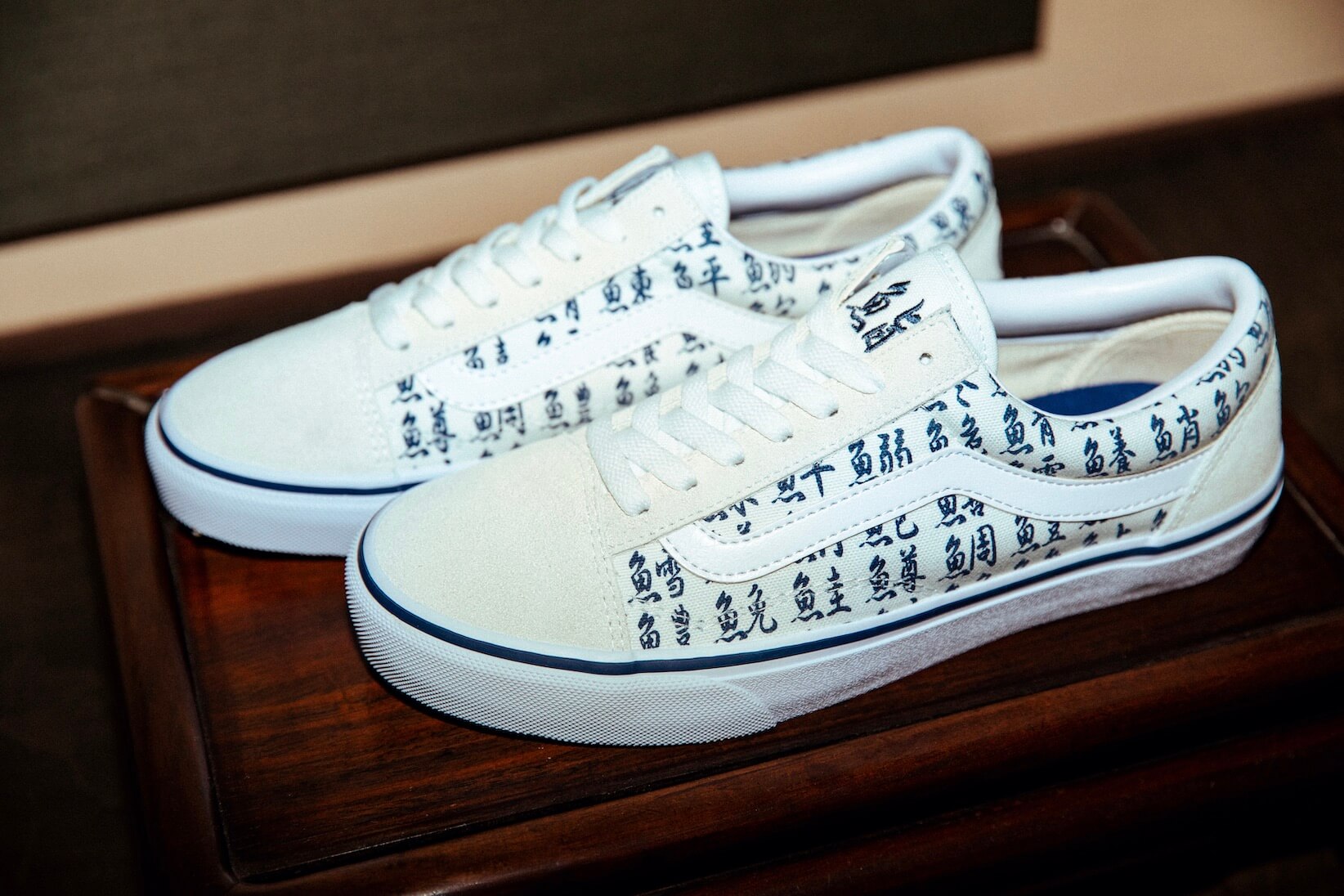 サイドパネルにぎっしりと並ぶ漢字が目を引くVANSのシューズ。タンには”鮨”の漢字が刺繍してあり、唯一無二の存在感を放つ