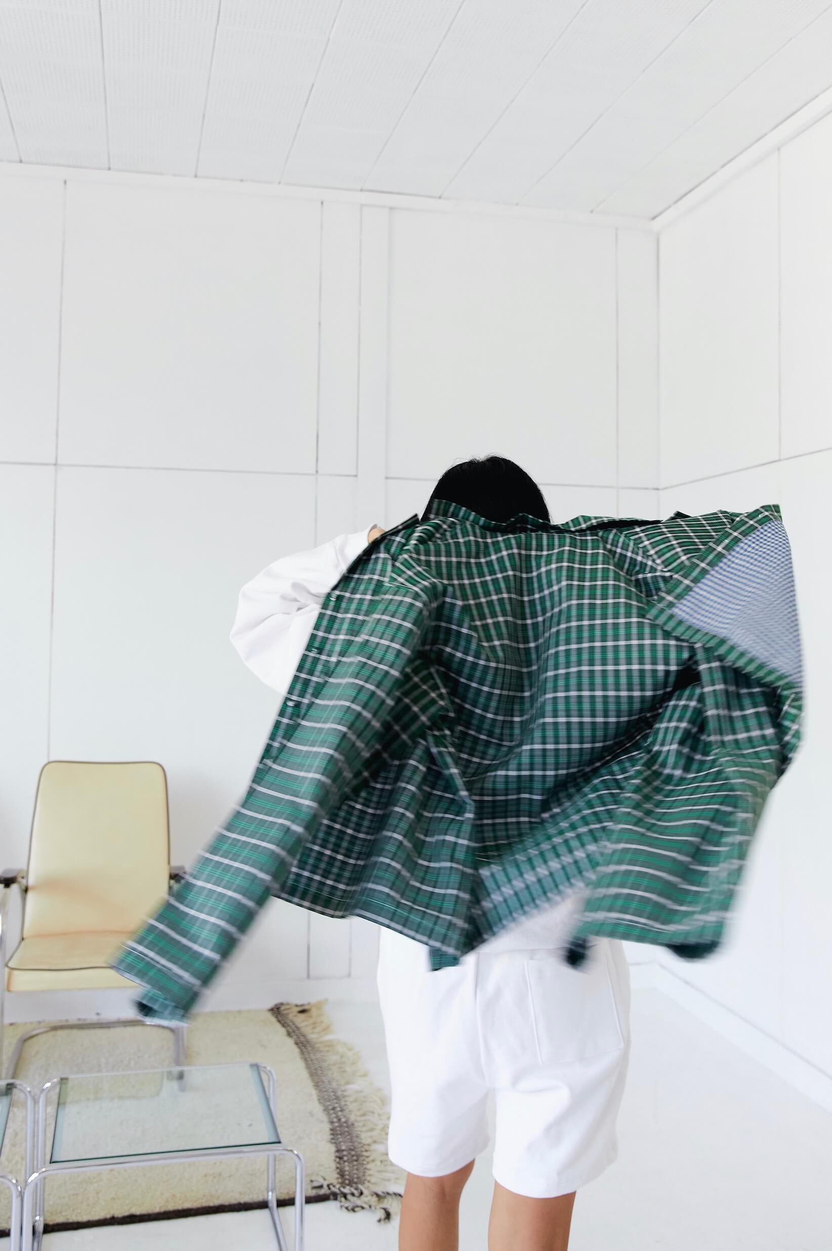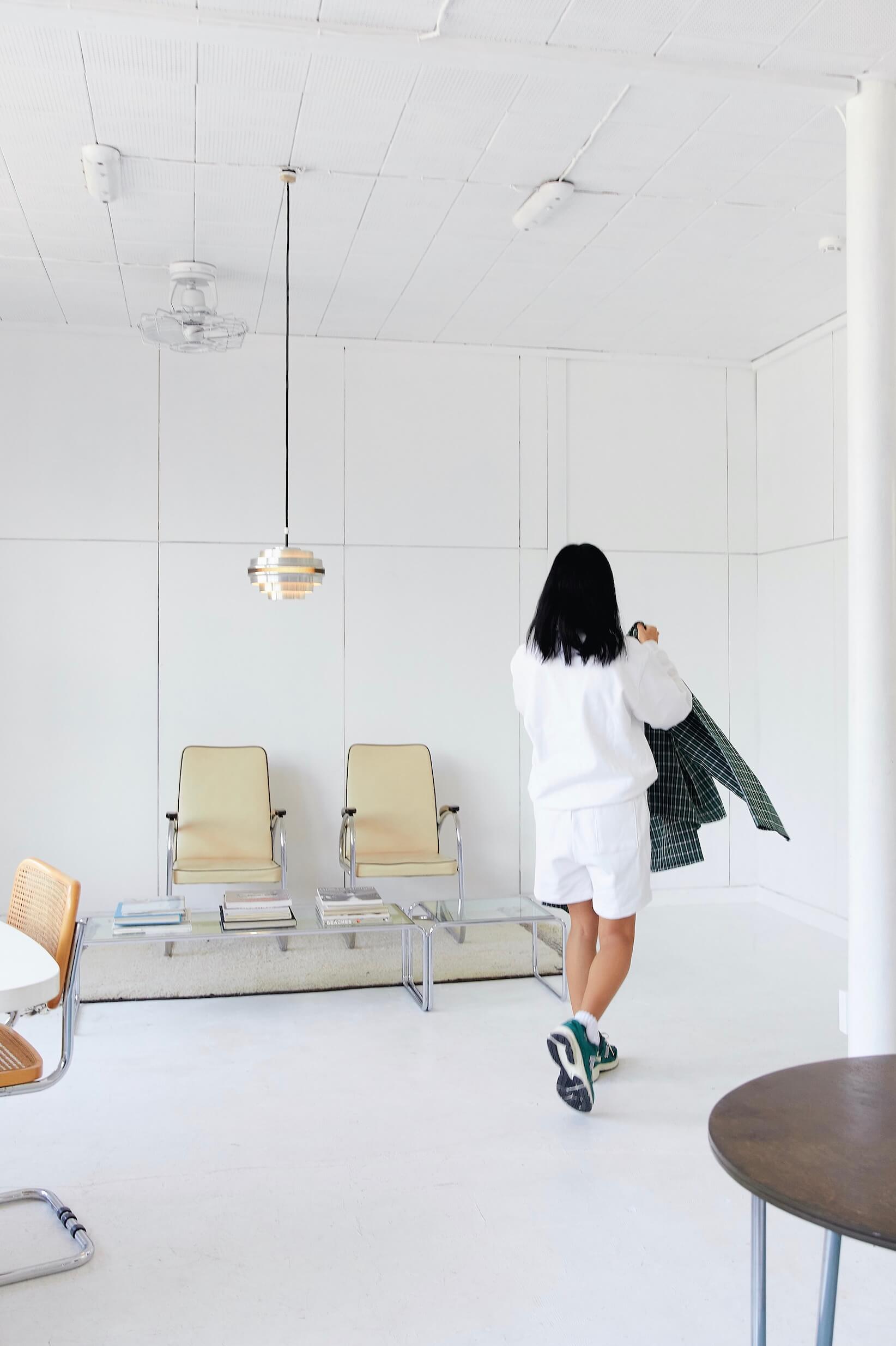 「ワントーンながらもパーツごとに色の層が異なっていて、ソールも外側と内側でデザイン違いになっているのが奥深いですね。このディテールや色の組み合わせはNew Balanceならではのユニークさだと思います。スウェットは上下ともに、短めのソックスも白でいさぎよく! チェック柄のシャツは差し色に。緑ってフェミニンにも寄りすぎないしメンズにも寄りすぎない。どんなコーディネートでもバランスがとりやすい」