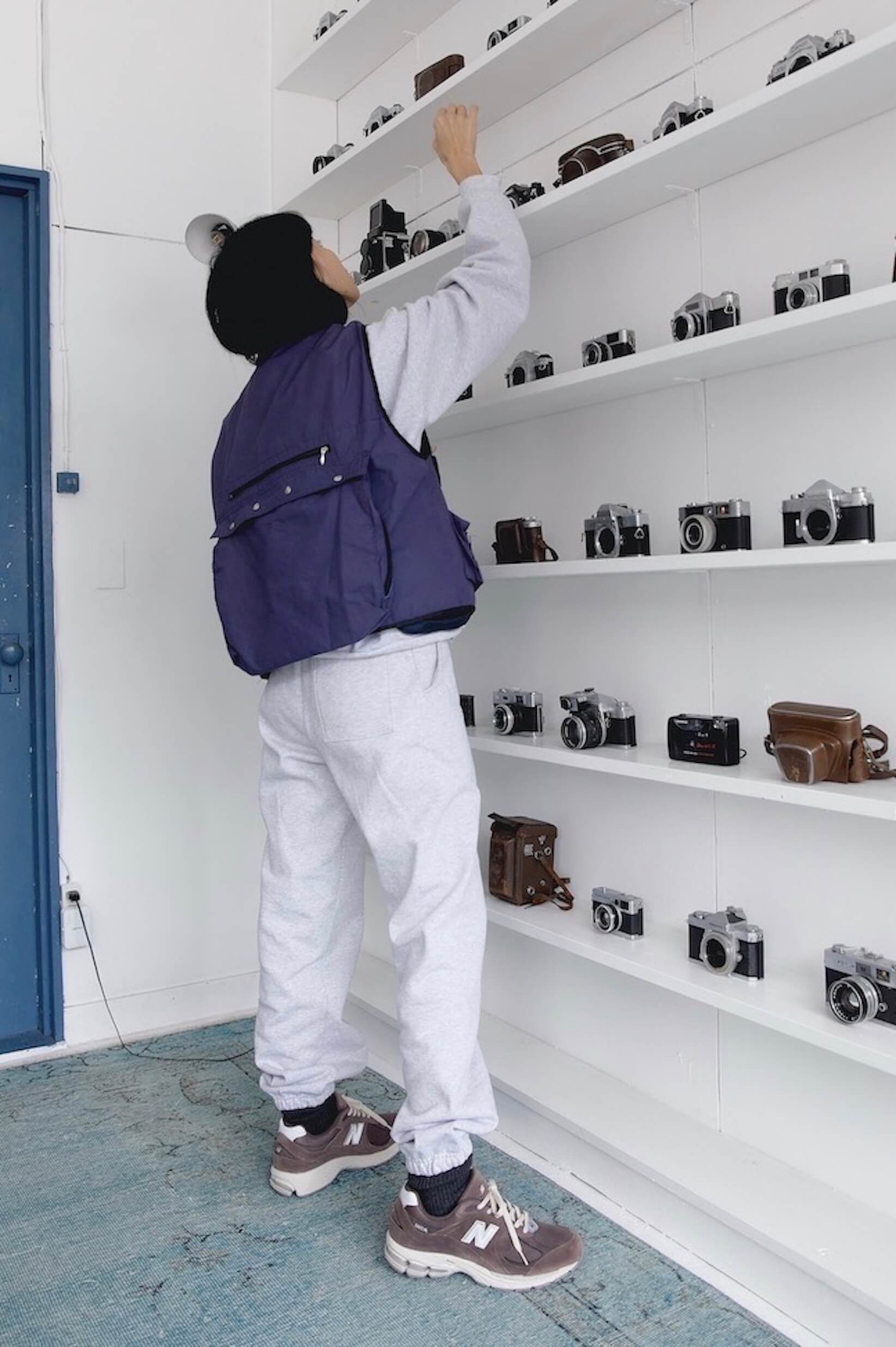 コーディネートを組むときのこだわりのひとつが色彩のバランスだという。たとえ異なるカラーの組み合わせであっても、明度と彩度が同じグループであることを心がけているそうだ。BLACK FIG のM2002R を合わせたコーディネートでは古着屋で購入したミリタリー調のベストに、アークテリクスのバッグでアウトドアの要素をミックス。ラフなスウェットスタイルに、足元にスモーキーなM2002Rをあわせることで大人のスポーツシックに。