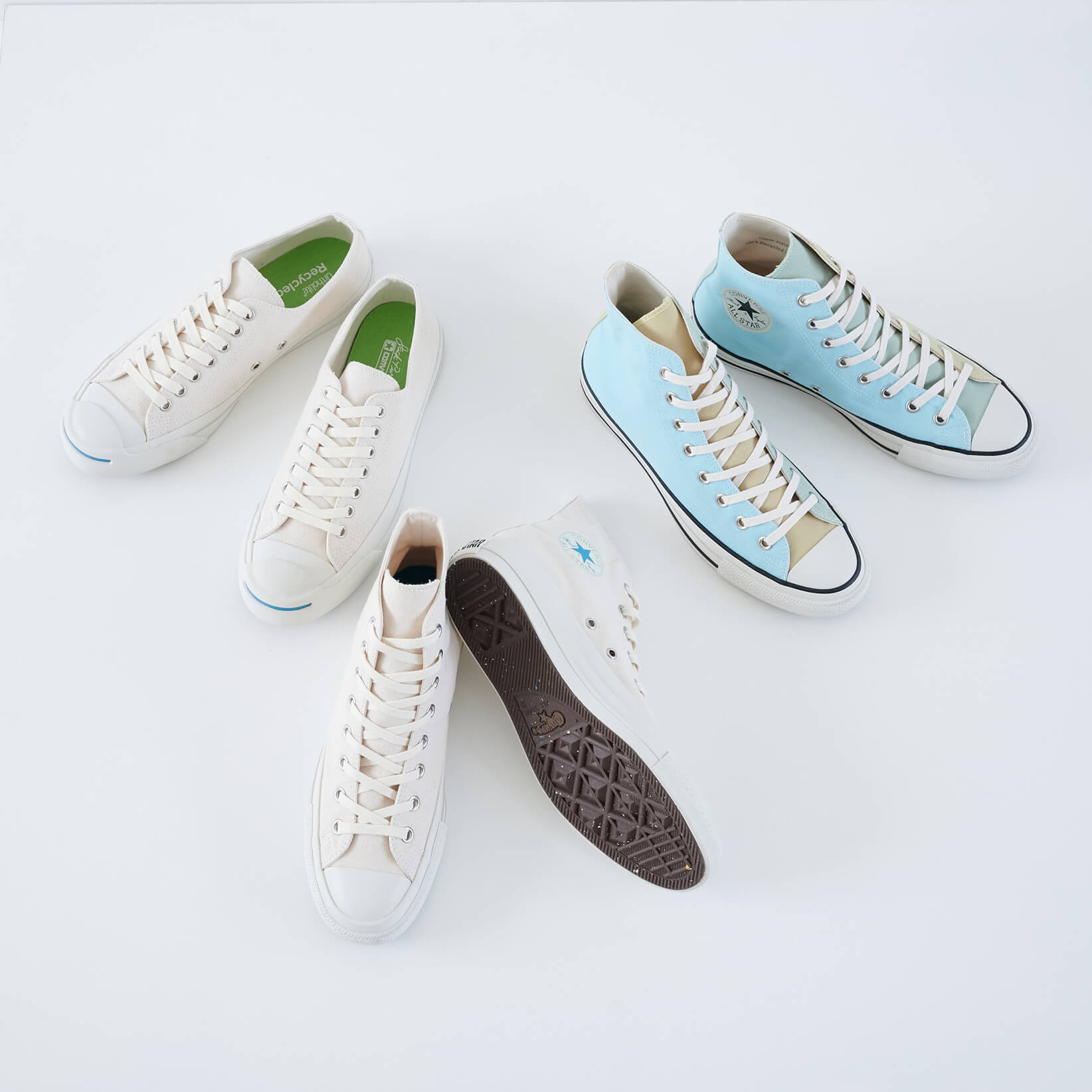 まず紹介するのは、生成り色の生地が柔らかく自然な印象の「JACK PURCELL MUSENSHOKU-CANVAS EC」と「ALL STAR MUSENSHOKU-CANVAS EC HI」。両モデル共通で、アッパーには自然環境に配慮した無染色キャンバス(オーガニックコットン)を採用。生地表面に綿カスが混じるナチュラルな風合いが特徴で、漂白や染色をしないことで、生地1メートル当たり約4.75リットルの水の使用量を削減できるのだとか。さらに、アンクルパッチやインソールなど随所に使われたのは、地球をモチーフにしたグリーンやブルー。サステナビリティをイメージさせるだけでなく、アクセントカラーとして春の装いに軽やかさをプラス。