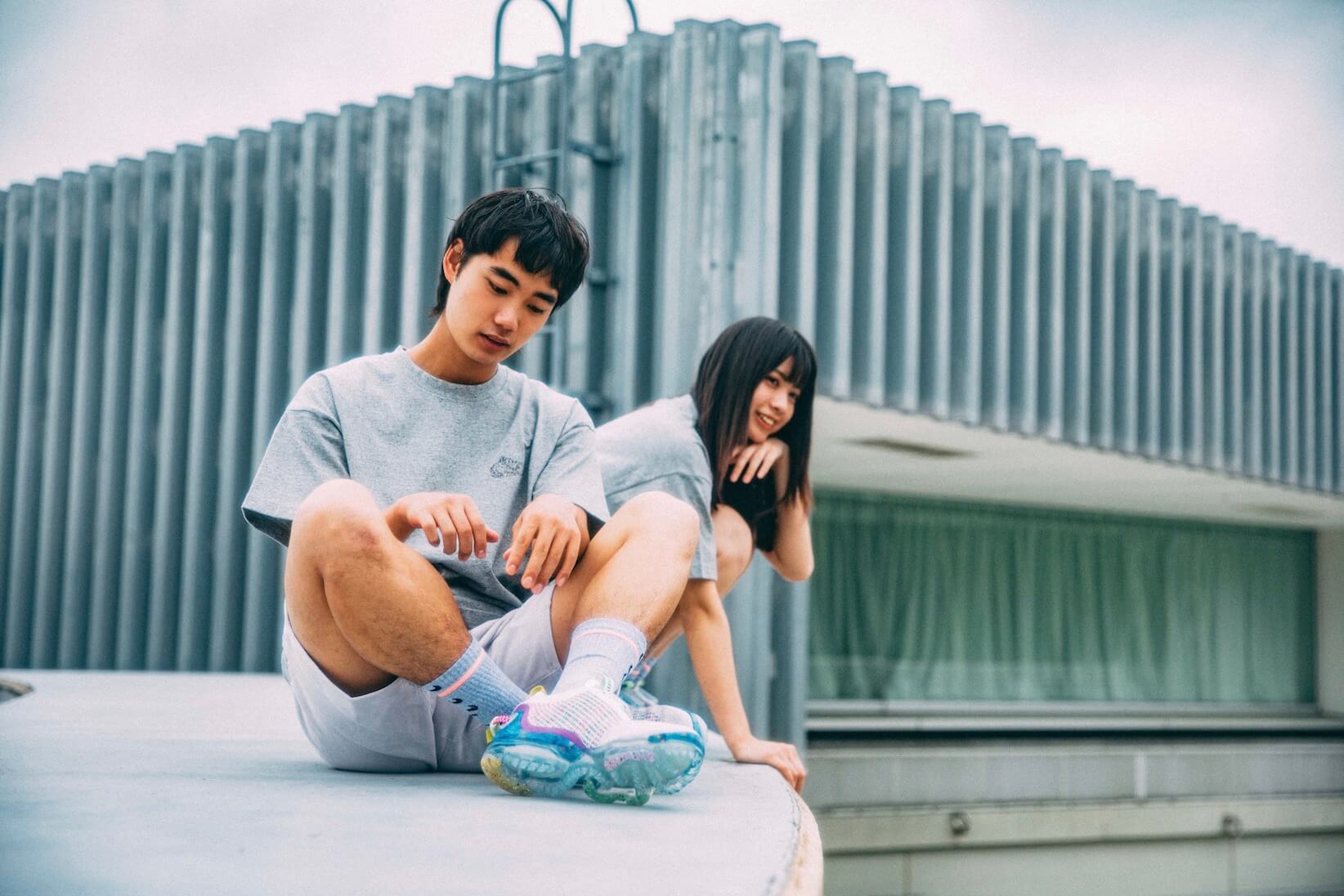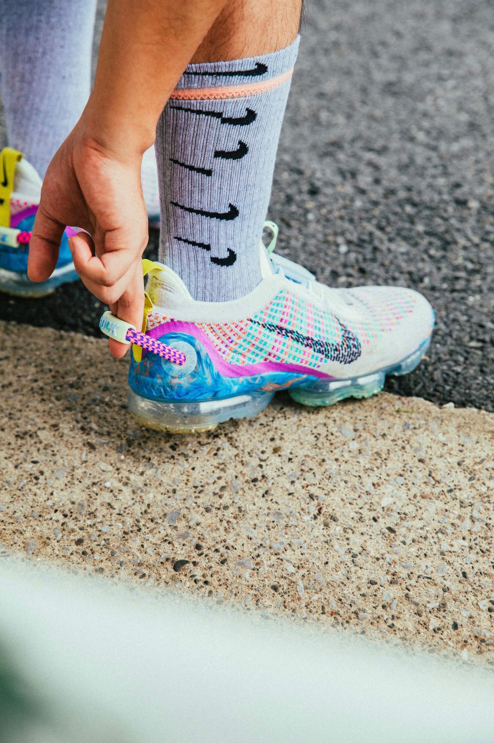 また、重量の50%以上にリサイクル素材を使用するだけでなく、クイックプルストラップの付いたFastFit編み構造を採用し、ヒールのストラップを引っ張ったりタンを持ち上げるだけで、イージーな着脱が可能に。通気性にも優れたリサイクルポリエステル製で、空気のような軽さに加えて発色性の良さも魅力。積み重ねたスウッシュのグラフィックがポップなソックスと合わせて、文字どおり“軽やかな足取り”を実感できるはず。