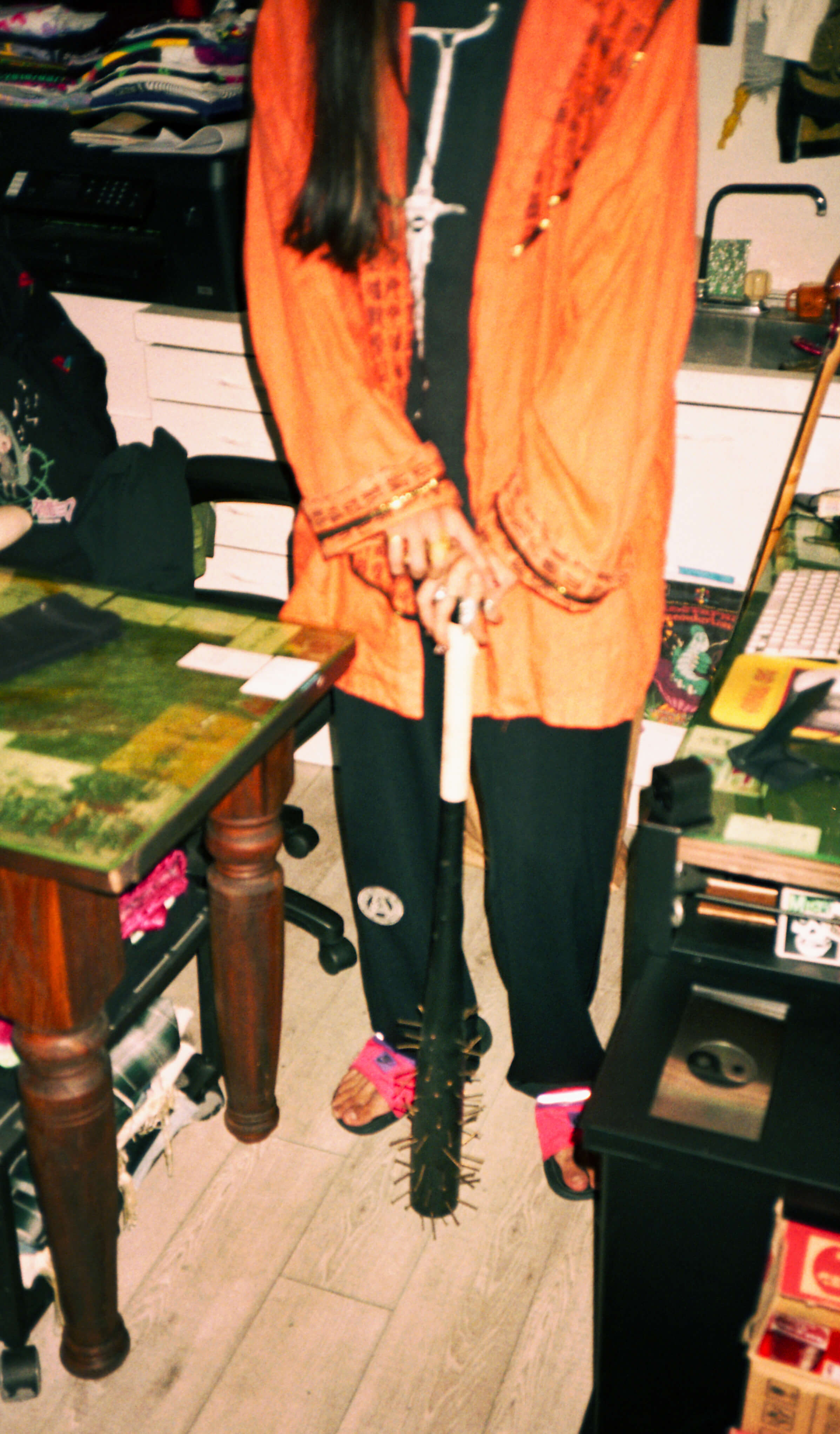 KIYO: 我ながら超正直だと思いますよ(笑)。ベーシックな服は普段から着ないですし、いま着ているものも古着とオリジナルのミックスです。インドの修道着みたいな古着にアイスキューブのヴィンテージTシャツとADULT VIRUSのパンツを合わせていて、どこの国なのかわからないミクスチャースタイルを提案していますね。「何系?」と聞かれるのが嬉しいんです。