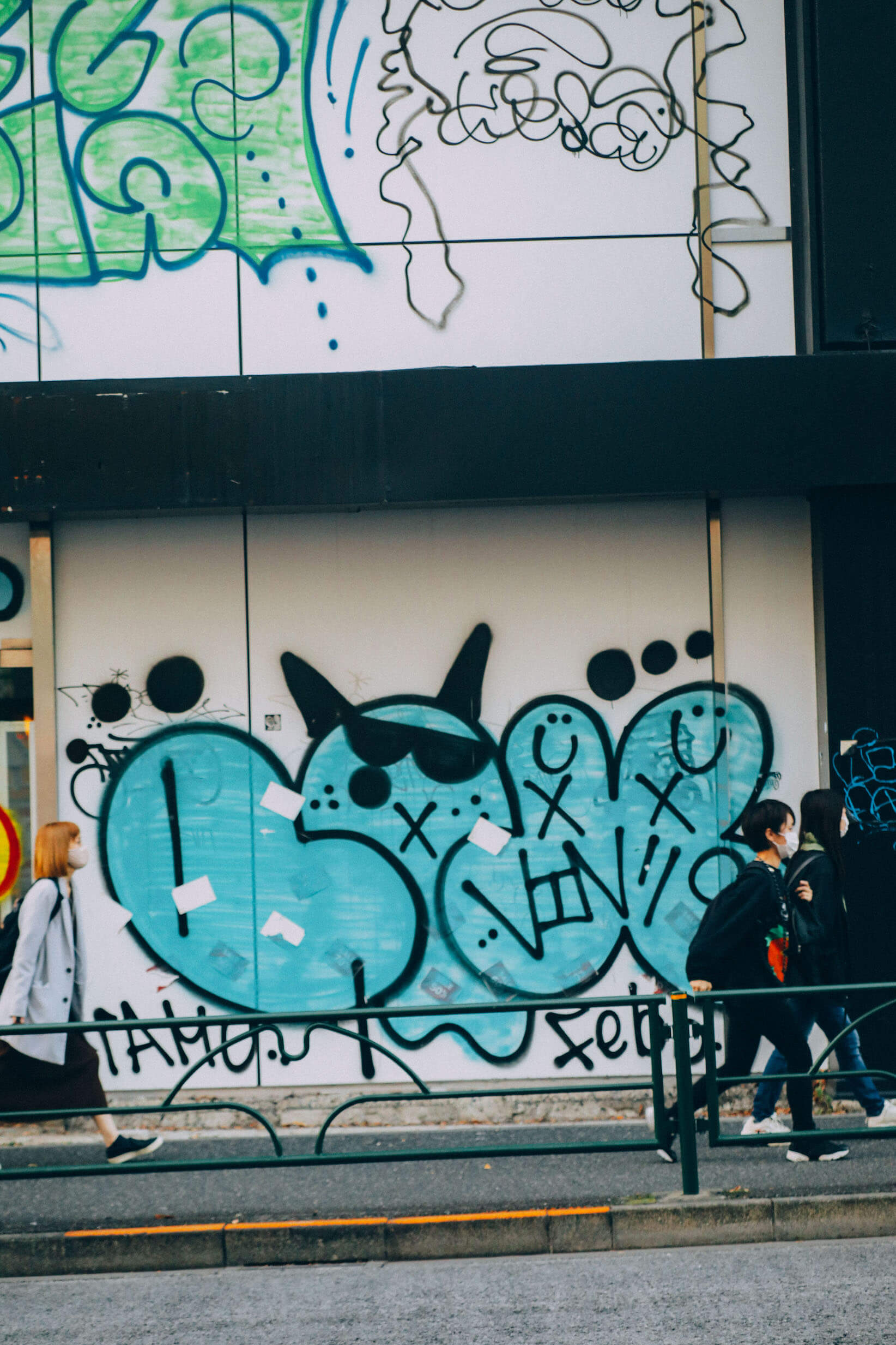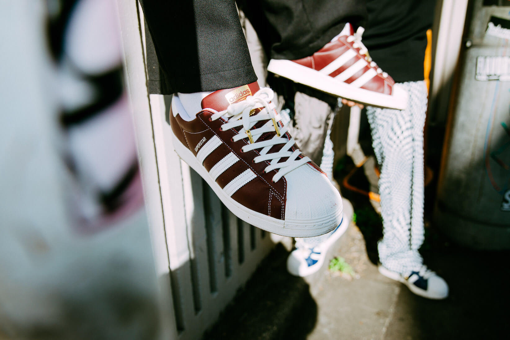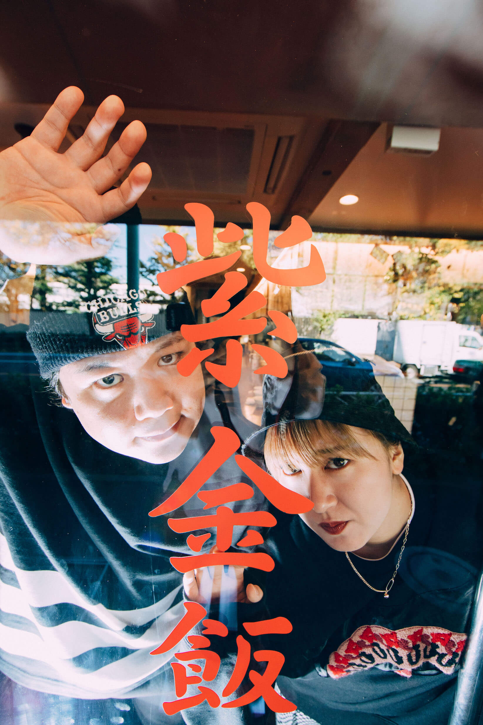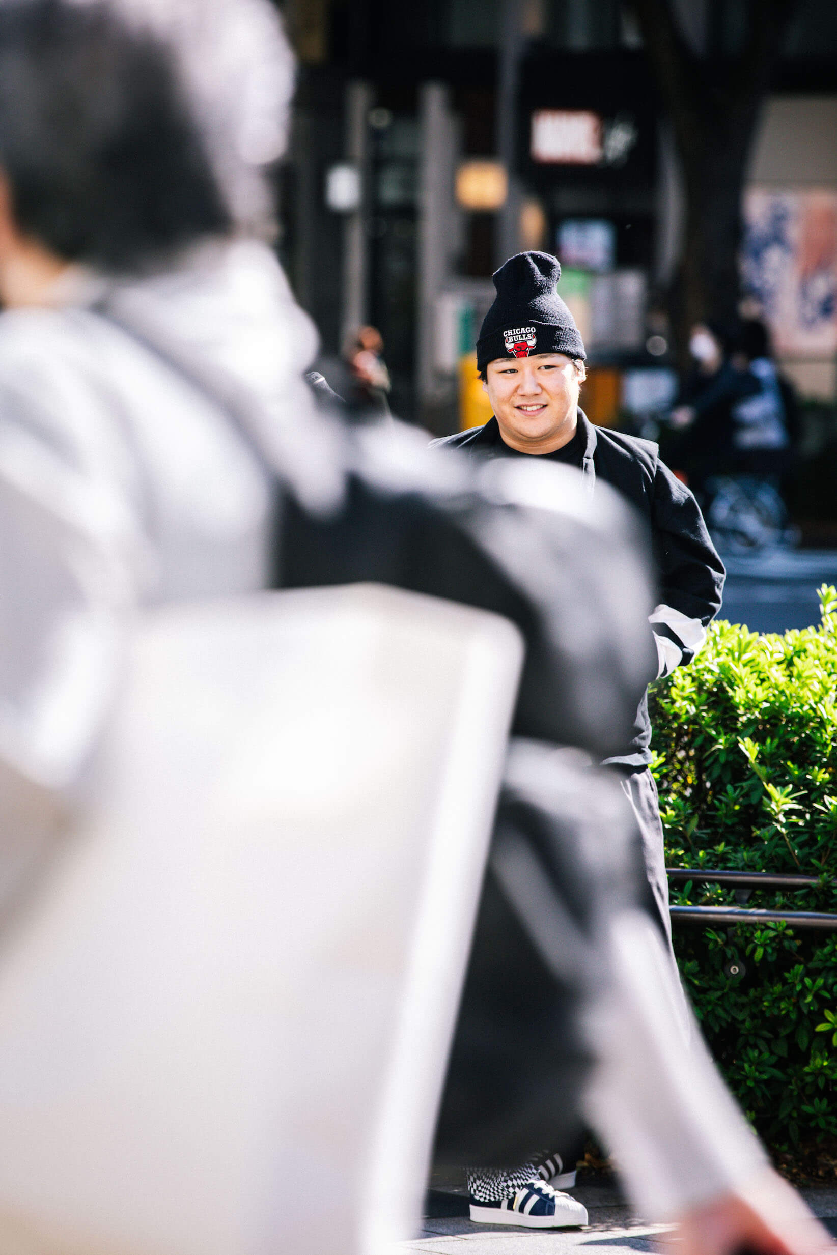 現在の店舗は昨年リノベーションされて、以前の赤いファサードはネオン管とグレーの外壁のスタイリッシュな印象に。ストリートウェアにadidas Originals「SUPERSTAR」を合わせた二人のスタイリングともマッチしている。